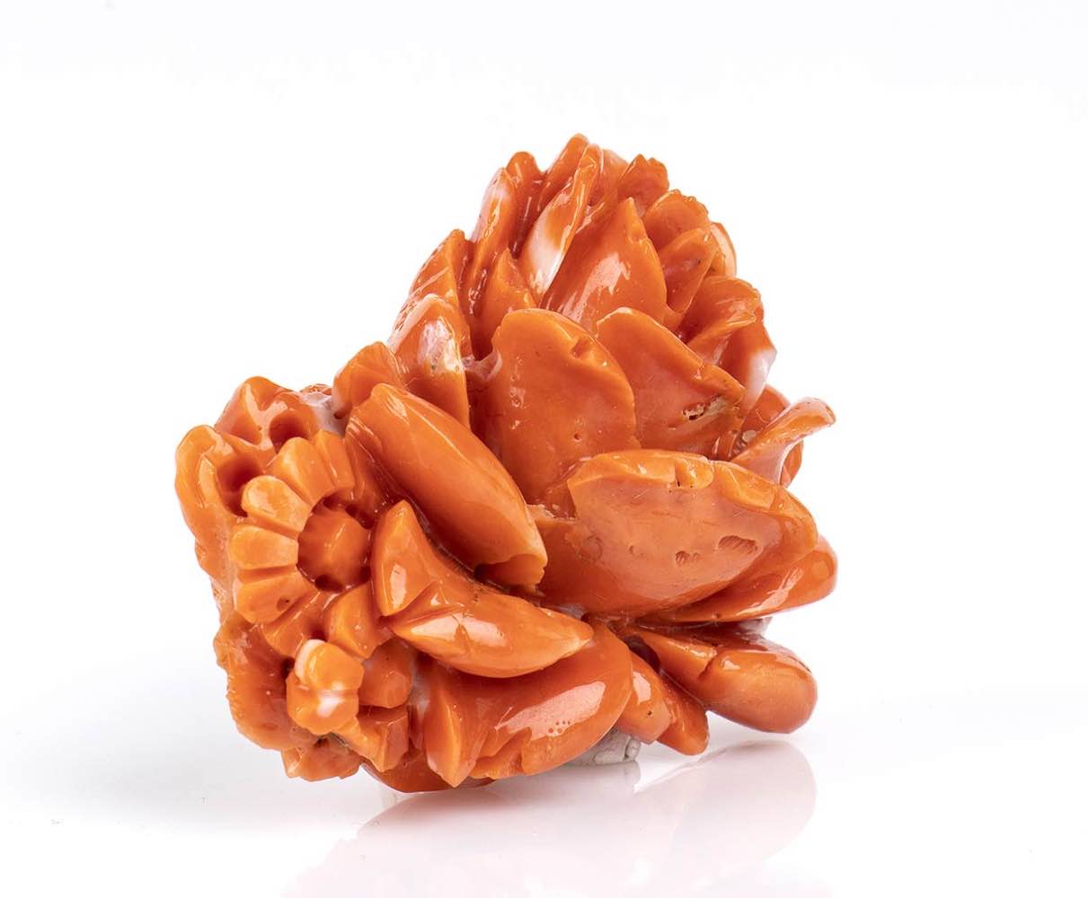 (corallium elatius) raffigurante rose. Dimensioni 5,5 x 4 x 2,1 cm. Peso 55,3 gr. Stato di conservazione: ***** eccellente.