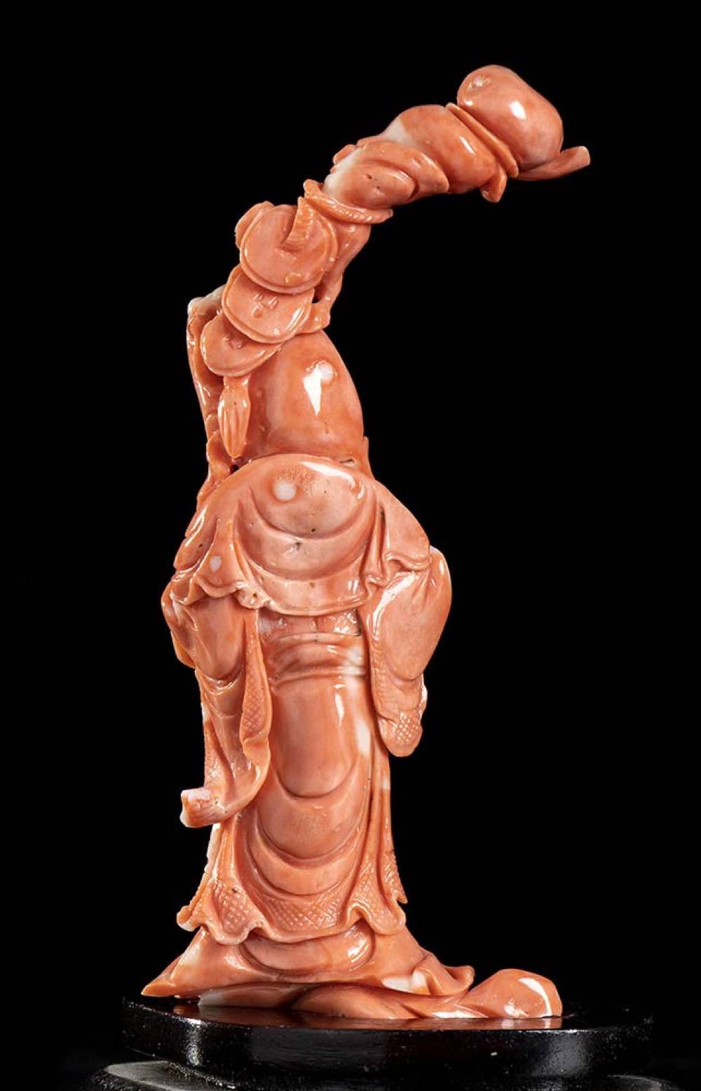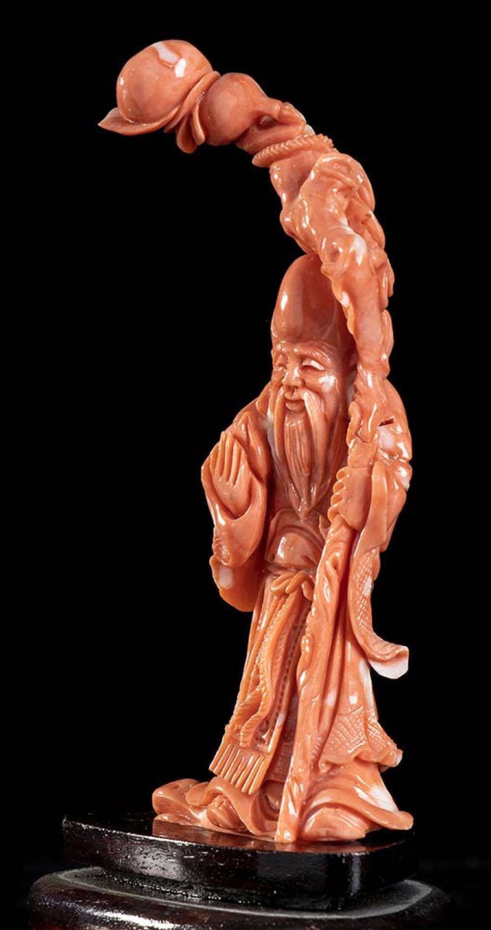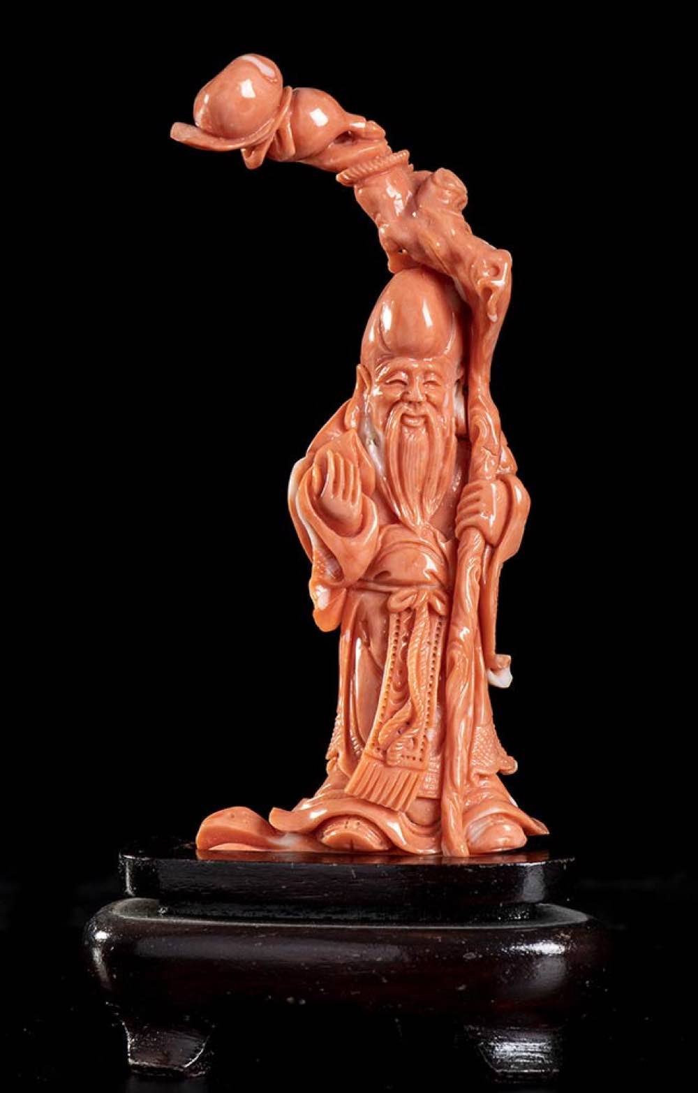 (corallium elatius) raffigurante Shoulao, il dio della longevità Taoista, la figura con il tipico cranio enorme, un bastone nodoso nella mano destra e una grande pesca in quella sinistra, simbolo di longevità. Base lignea. Dimensioni scultura 12,7 x 5 x 2,2 cm, base 3,1 x 7,7 x 5 cm. Peso scultura 70,3 gr. Stato di conservazione: ***** eccellente.