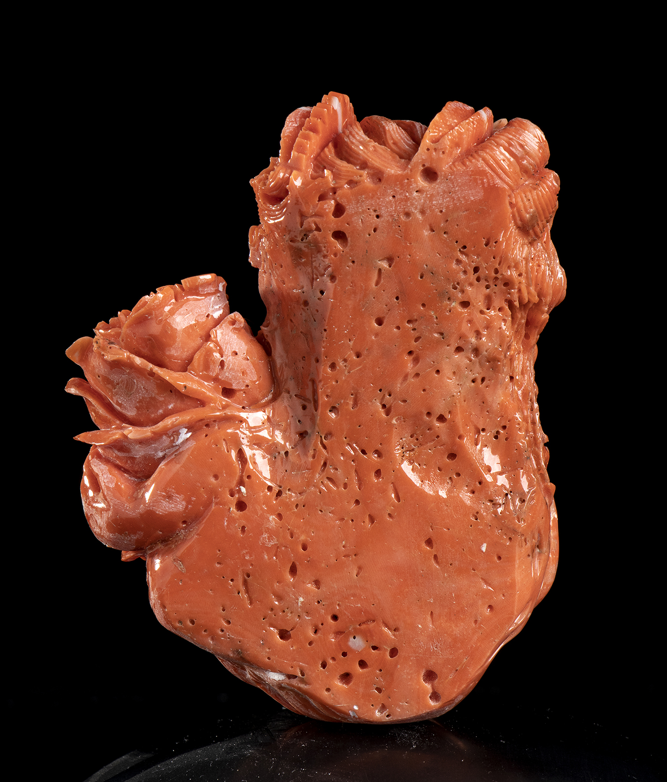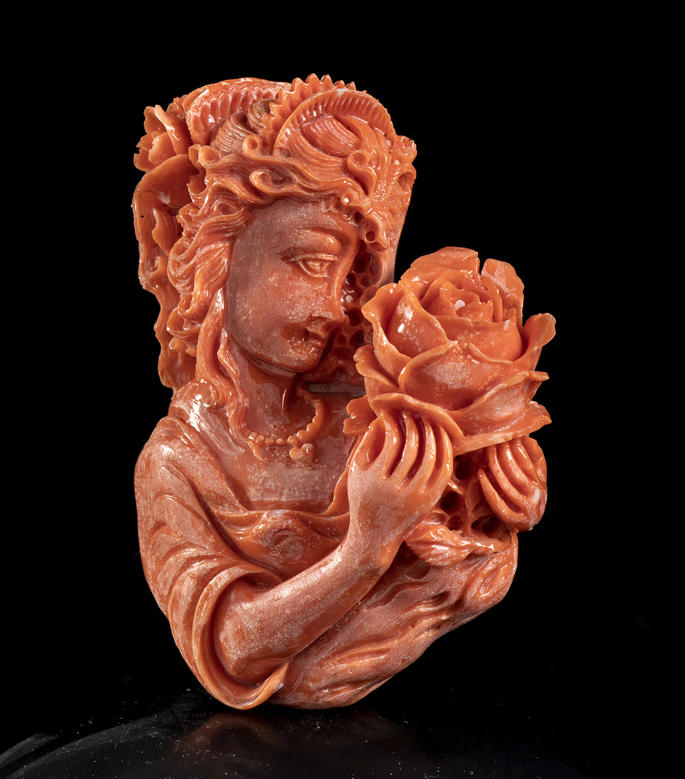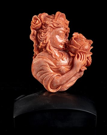 (corallium elatius) raffigurante un busto femminile con rosa posto sopra una base in materiale composito. Dimensioni scultura 8,7 x 7,4 x 2,7 cm, base 3,4 x 8.8 x 8,8 cm. Peso scultura 215 gr. Stato di conservazione: ***** eccellente.