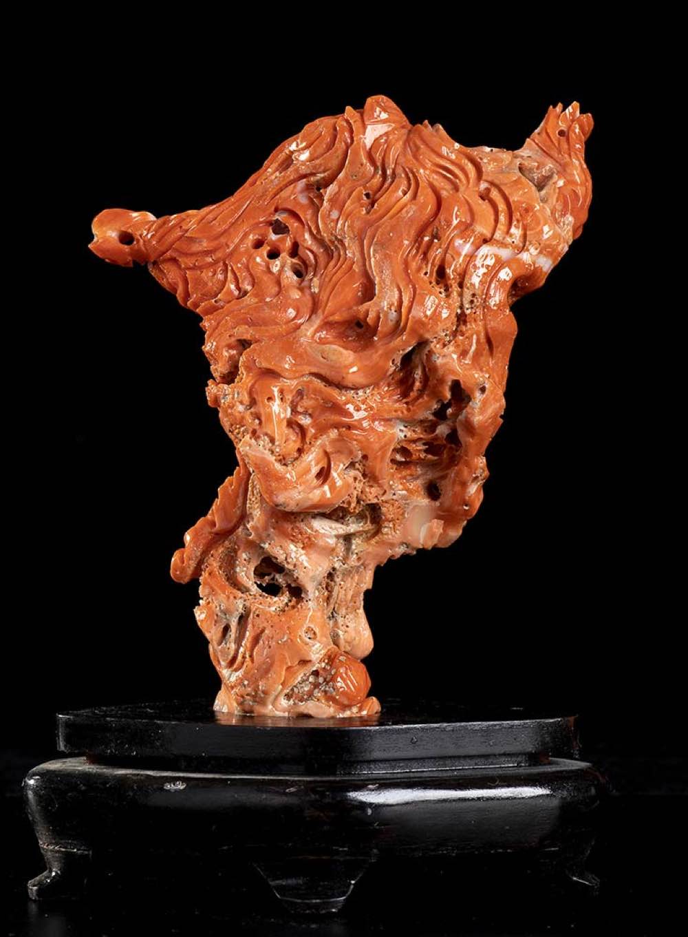 (corallium elatius) raffigurante una maschera posta su una base lignea. Dimensioni scultura 13 x 9 x 3,5 cm, base 3,3 x 10,5 x 6,2 cm. Peso scultura 166,7 gr. Stato di conservazione: ***** eccellente.