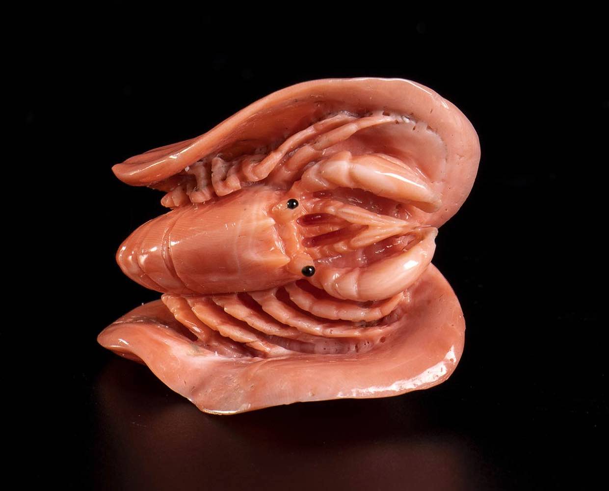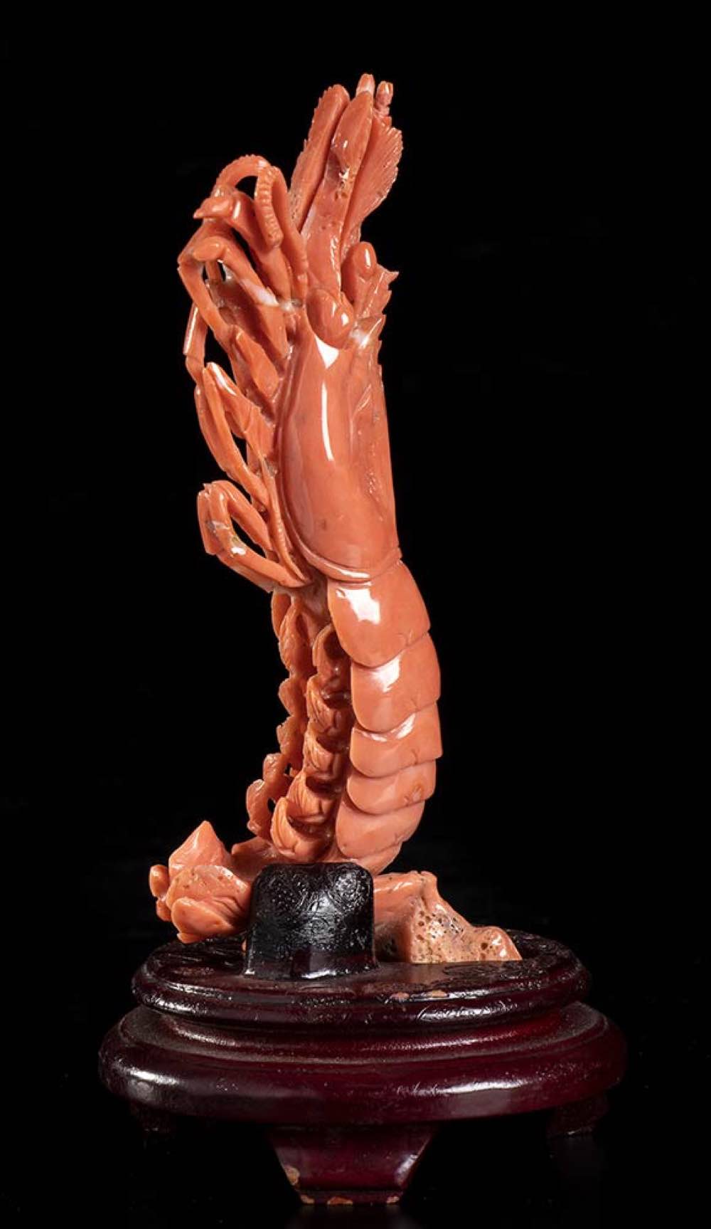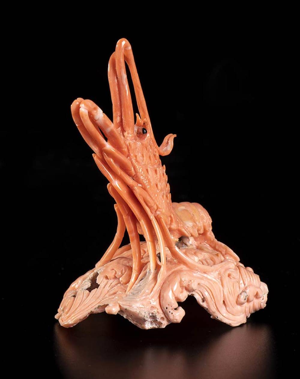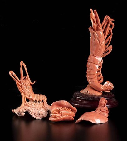 (corallium elatius) raffiguranti un gamberone posto su una base lignea, dimensioni 14 x 6 x 2,5 cm, peso scultura 107,5 gr; uno scampo, dimensioni 8,5 x 7,6 x 6 cm, peso 57,4 gr; un polipo, dimensioni 3,2 x 5,3 x 3,3 cm, peso 22,8 gr; una conchiglia con un picccolo astice, dimensioni 2,8 x 3,9 x 3,1 cm, peso 23,7 gr. Stato di conservazione: **** buono (difetti al gamberone).