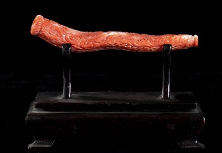 (corallium elatius) raffigurante un bocchino per sigaretta posto su una base lignea. Dimensioni scultura 11,7 x 1,8 x 1,5 cm, base 7 x 12,5 x 5 cm. Peso scultura 50,6 gr. Stato di conservazione: ***** eccellente.