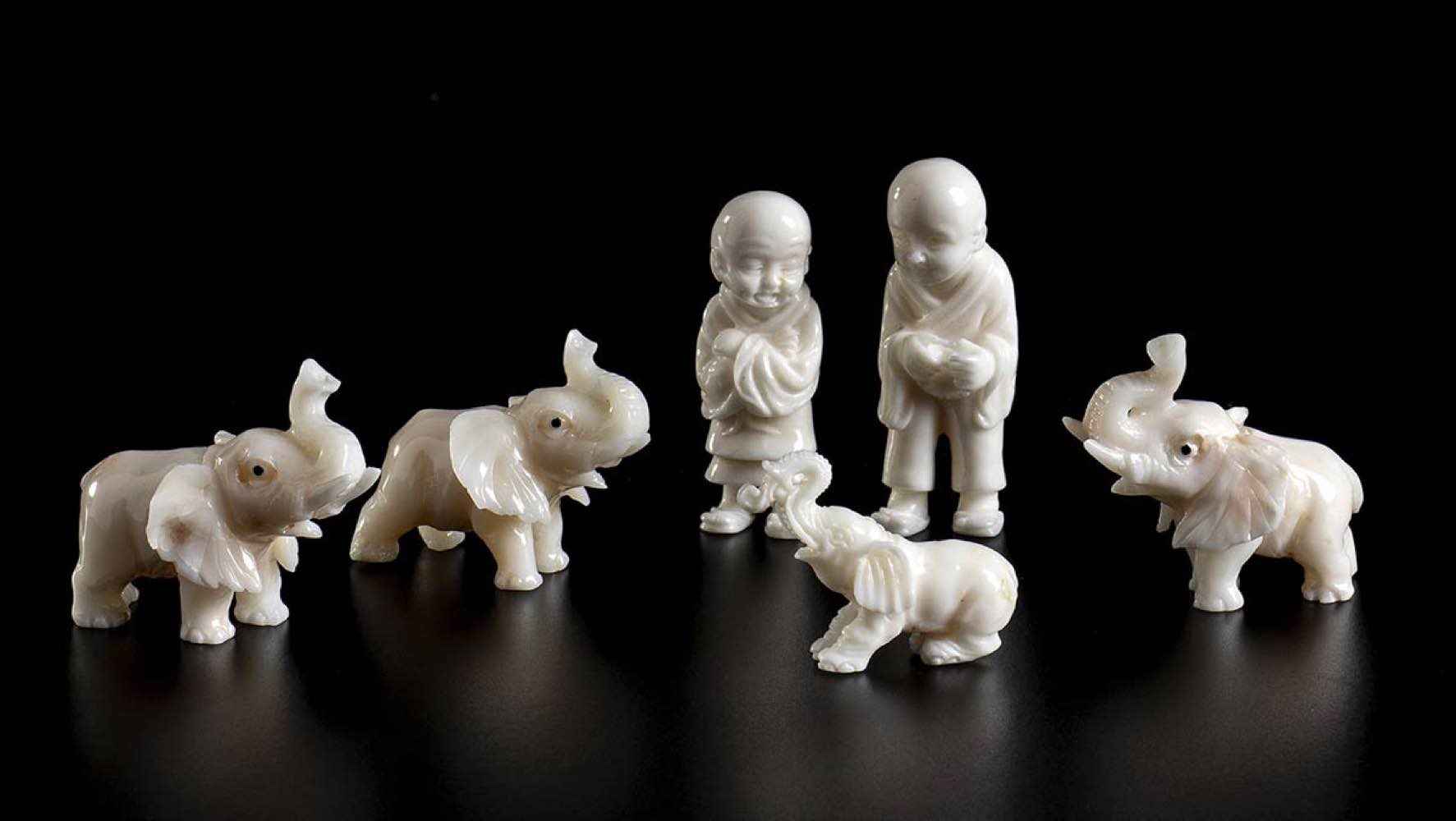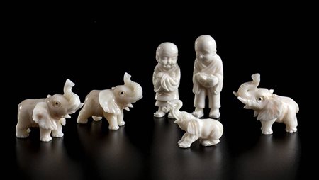 (corallium konjoi) raffiguranti 4 elefanti e 2 bambini. Dimensioni 3,5 x 4,5 x 2,1 cm; 3,6 x 4,7 x 2,1 cm; 3,3 x 4 x 2,2 cm; 2,7 x 3,7 x 1 cm; 4,7 x 1,7 x 1,5 cm; 4,7 x 1,4 x 1,2 cm. Peso complessivo 93,8 gr. Stato di conservazione: ***** eccellente.