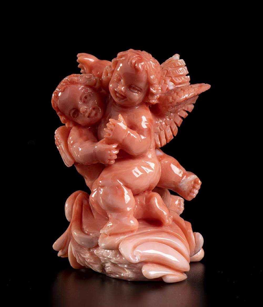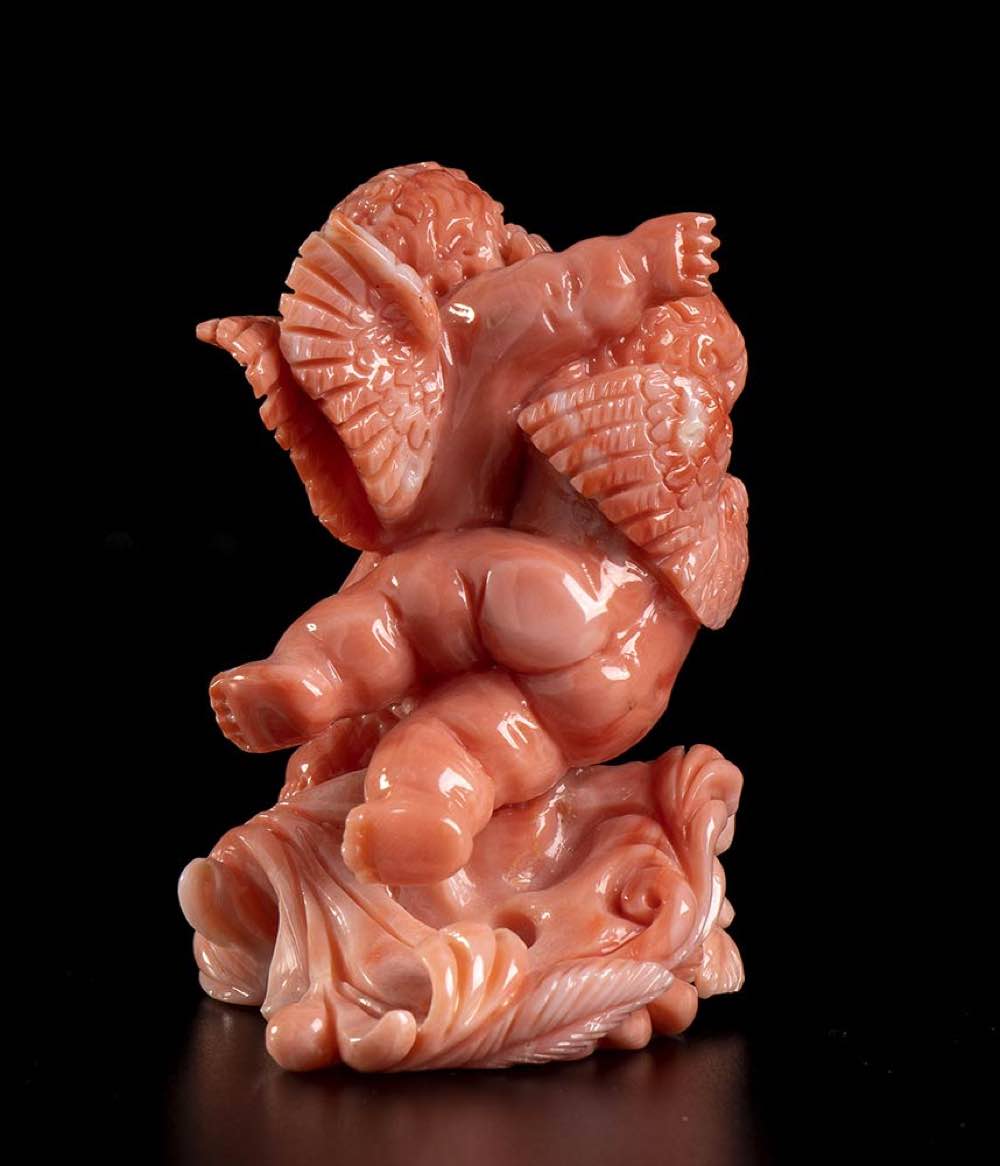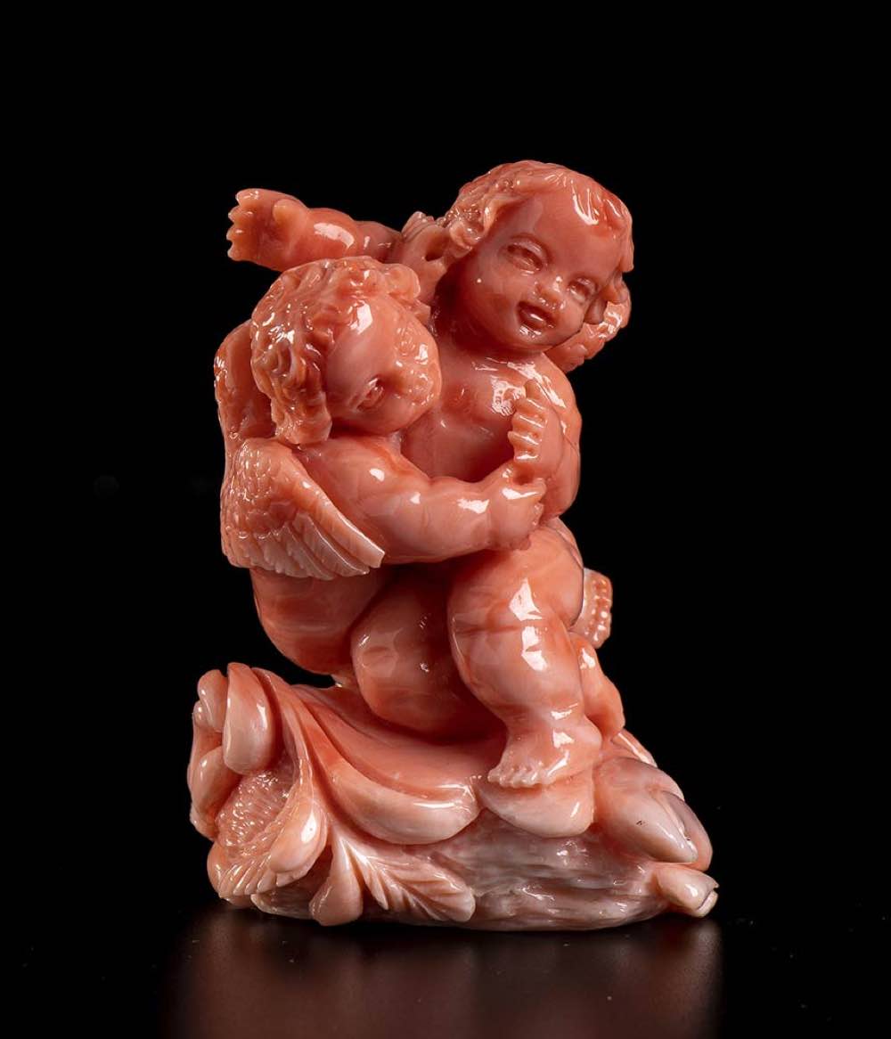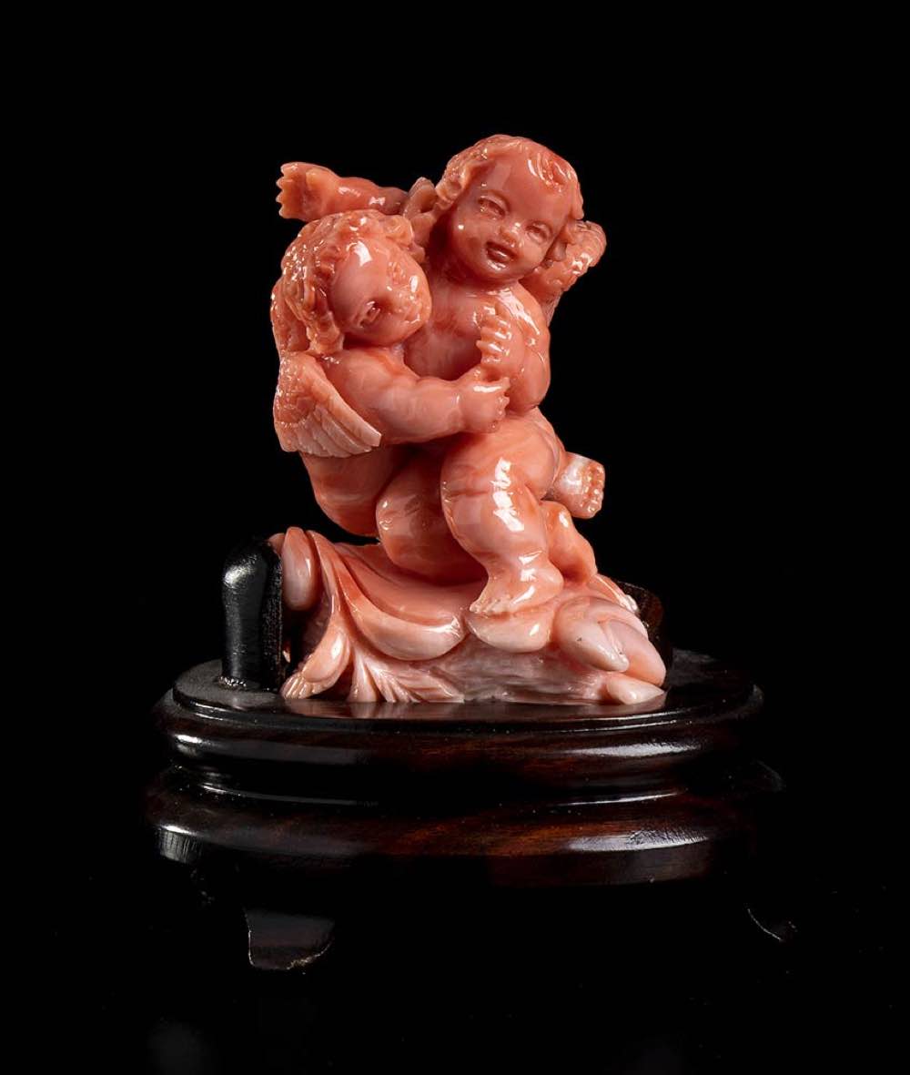 (corallium elatius) raffigurante due putti alati posti sopra una base lignea. Dimensioni base 6,8 x 6,5 x 2,7 cm. Peso scultura 79,4 gr. Stato di conservazione: ***** eccellente.