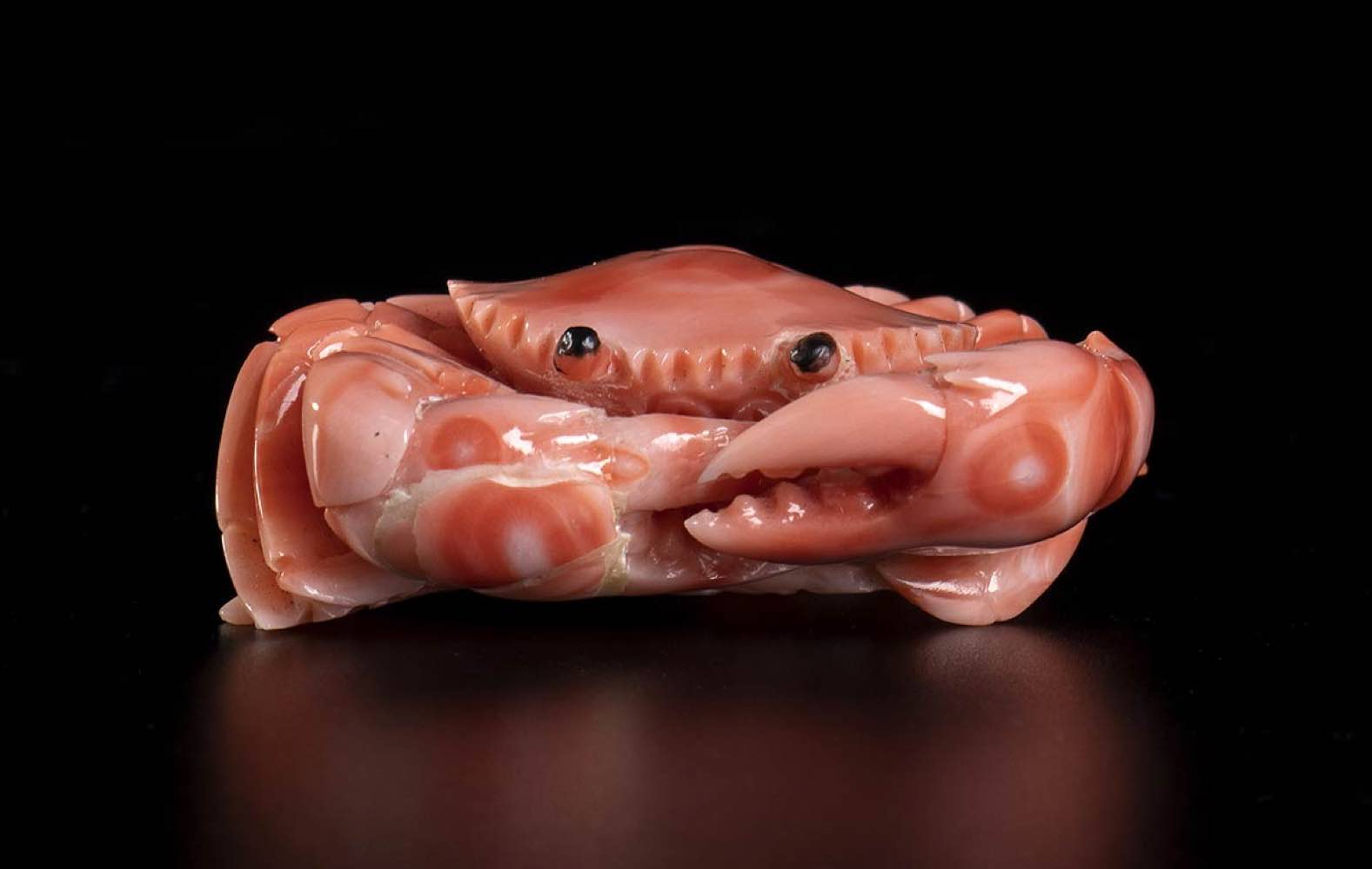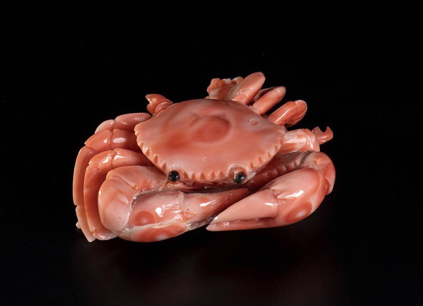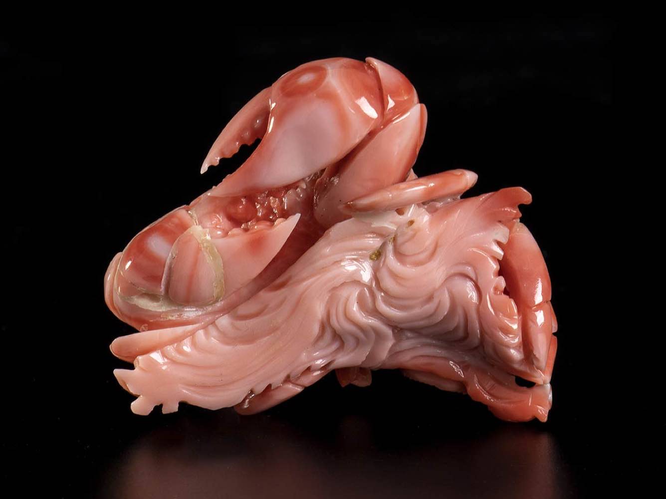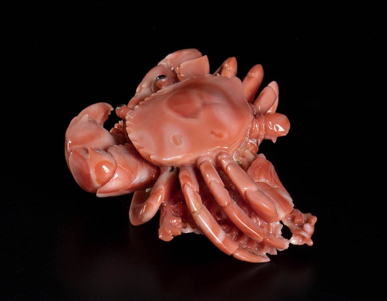 (corallium elatius) raffigurante un granchio. Dimensioni 2 x 6 x 5 cm. Peso 51,1 gr. Stato di conservazione: ***** eccellente.