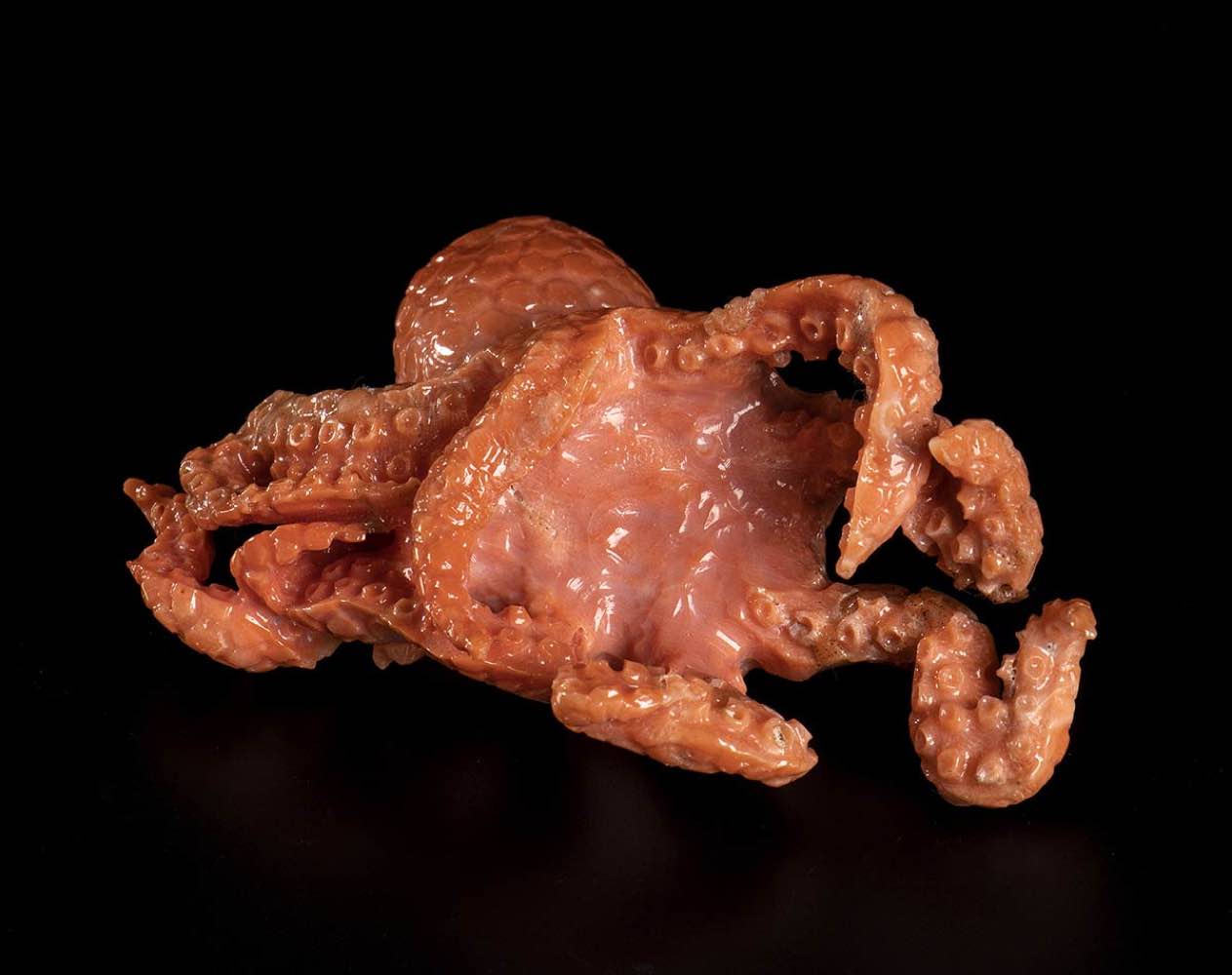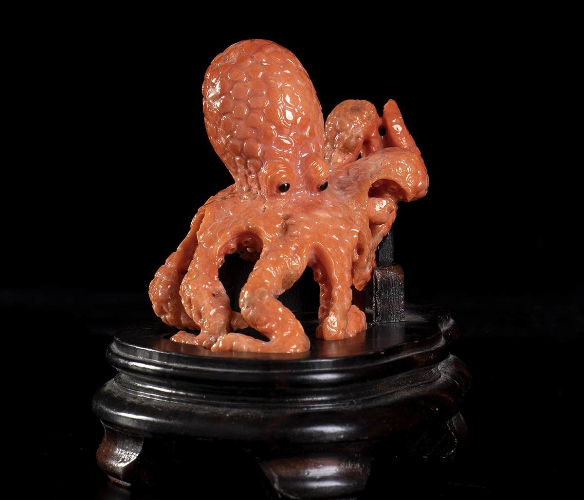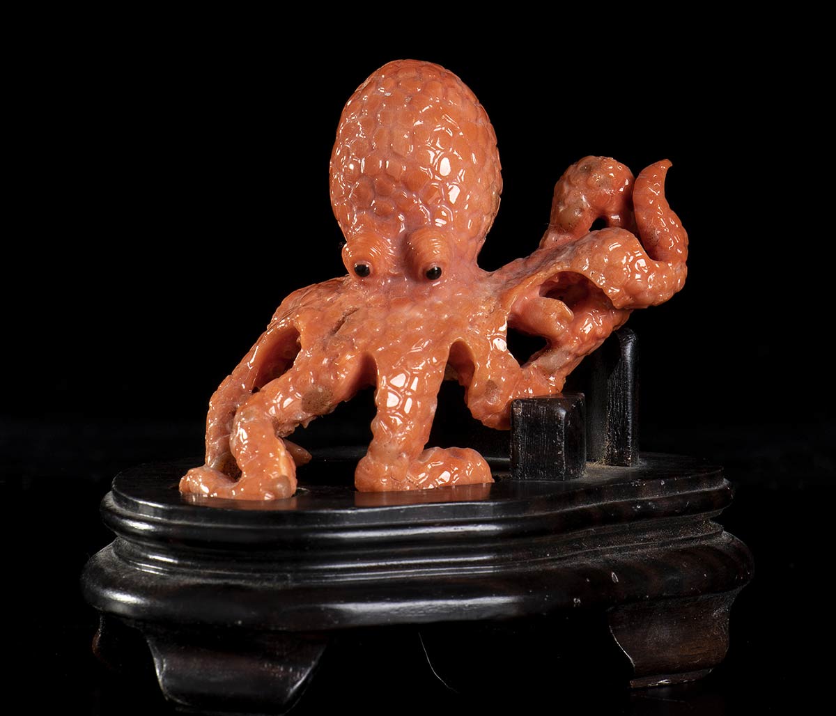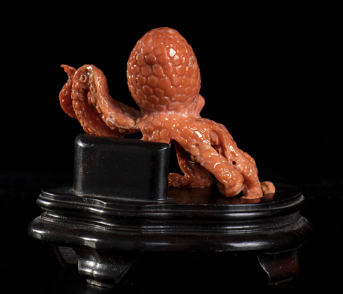 (corallium elatius) raffigurante un polipo posto su una base lignea. Dimensioni scultura 5 x 7,5 x 4 cm, base 2,6 x 8,9 x 6 cm. Peso scultura 52 gr. Stato di conservazione: ***** eccellente.