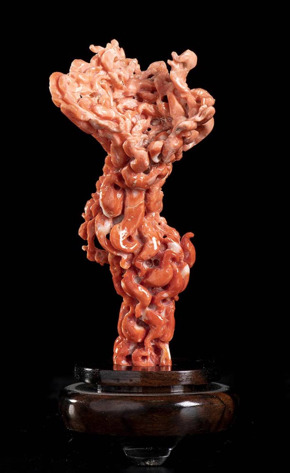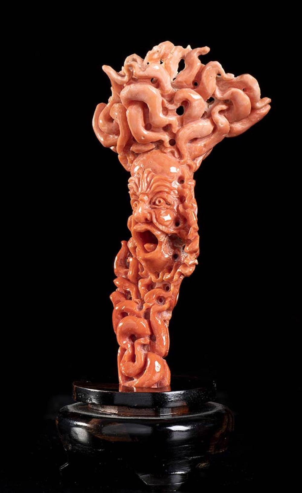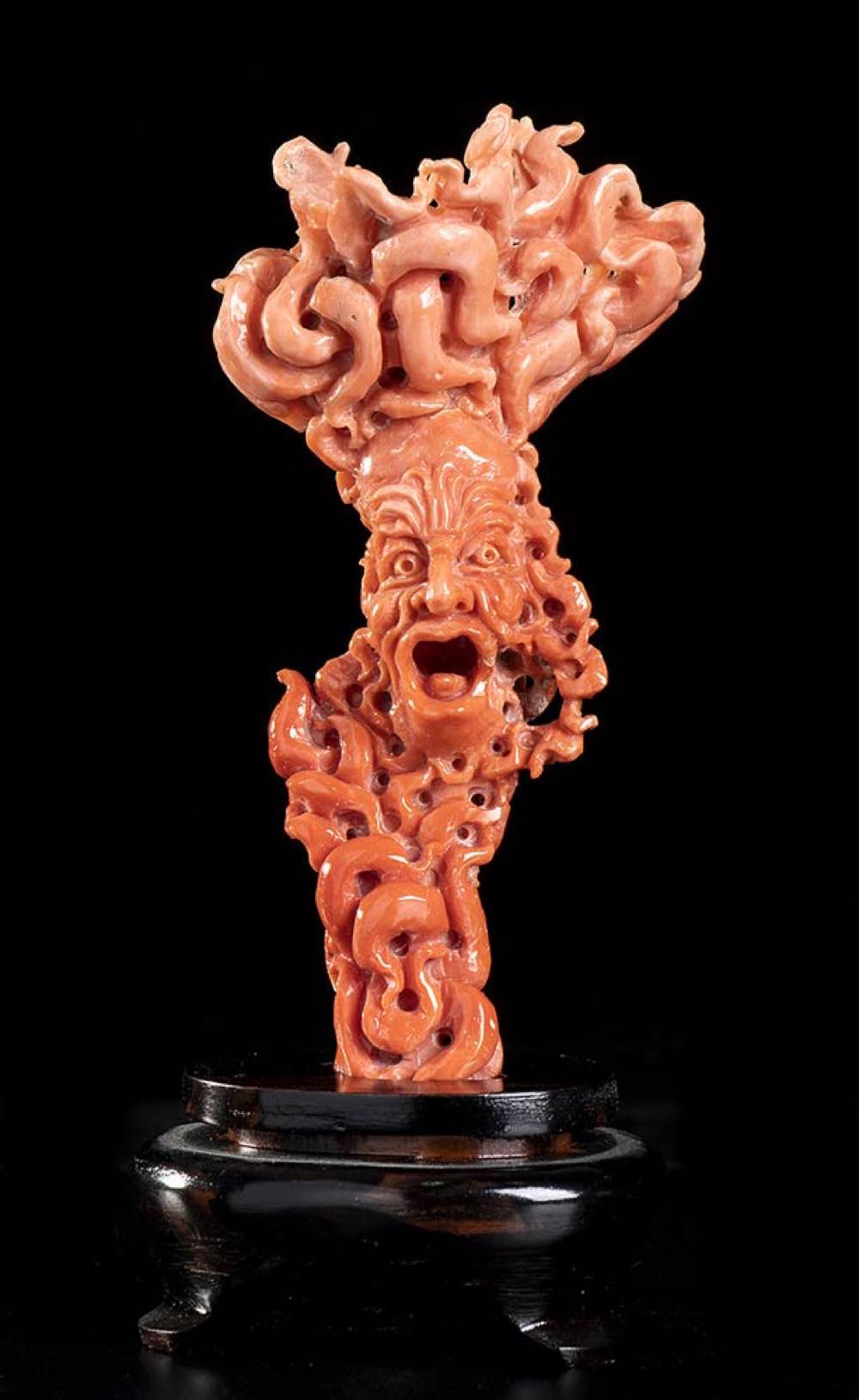 (corallium elatius) raffigurante una maschera posta su una base lignea. Dimensioni scultura 11,8 x 5,4 x 4,2 cm, base 3,1 x 6,1 x 5,3 cm. Peso scultura 77,9 gr. Stato di conservazione: ***** eccellente.
