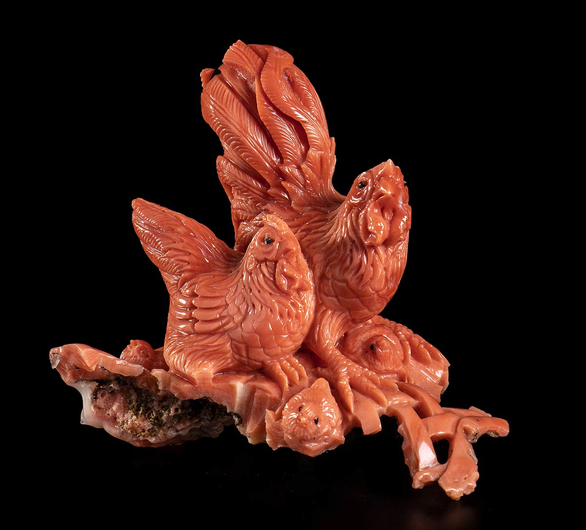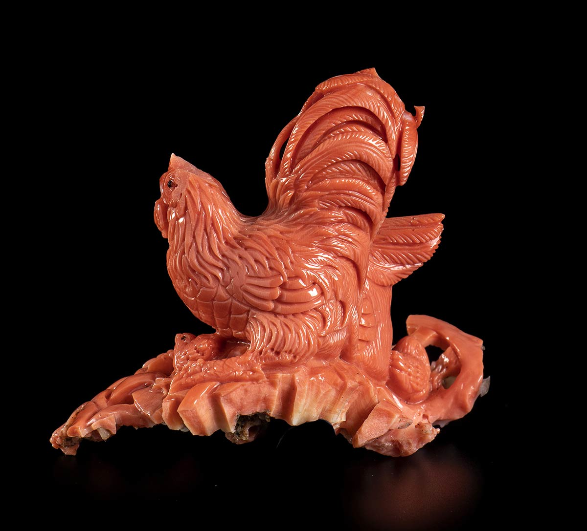 (corallium elatius) raffigurante un gallo ed una gallina. Dimensioni 6 x 6,8 x 3,8 cm. Peso 65,8 gr. Stato di conservazione: ***** eccellente.