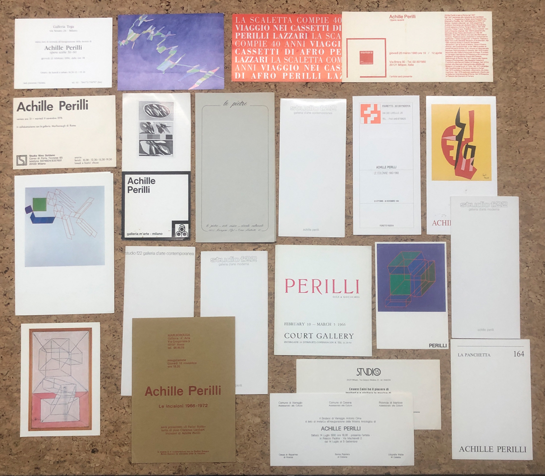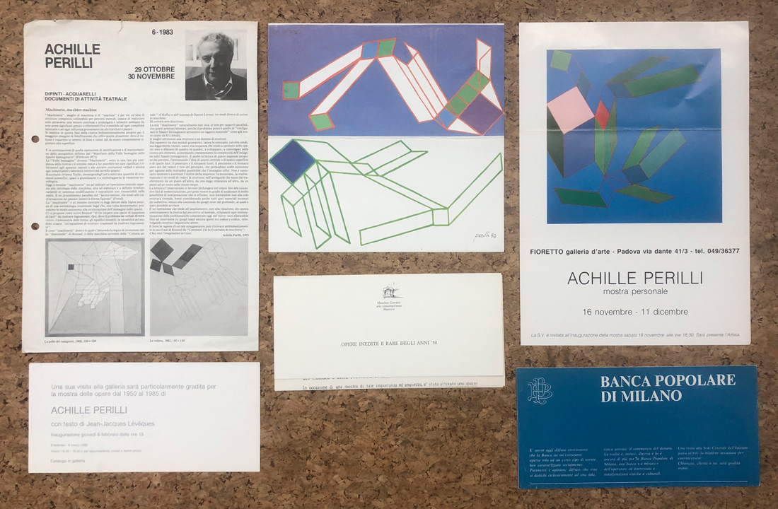 Lotto unico di 27 storici documenti (tra cui depliant, inviti e cartoncini) relativi all'opera di Achille Perilli: