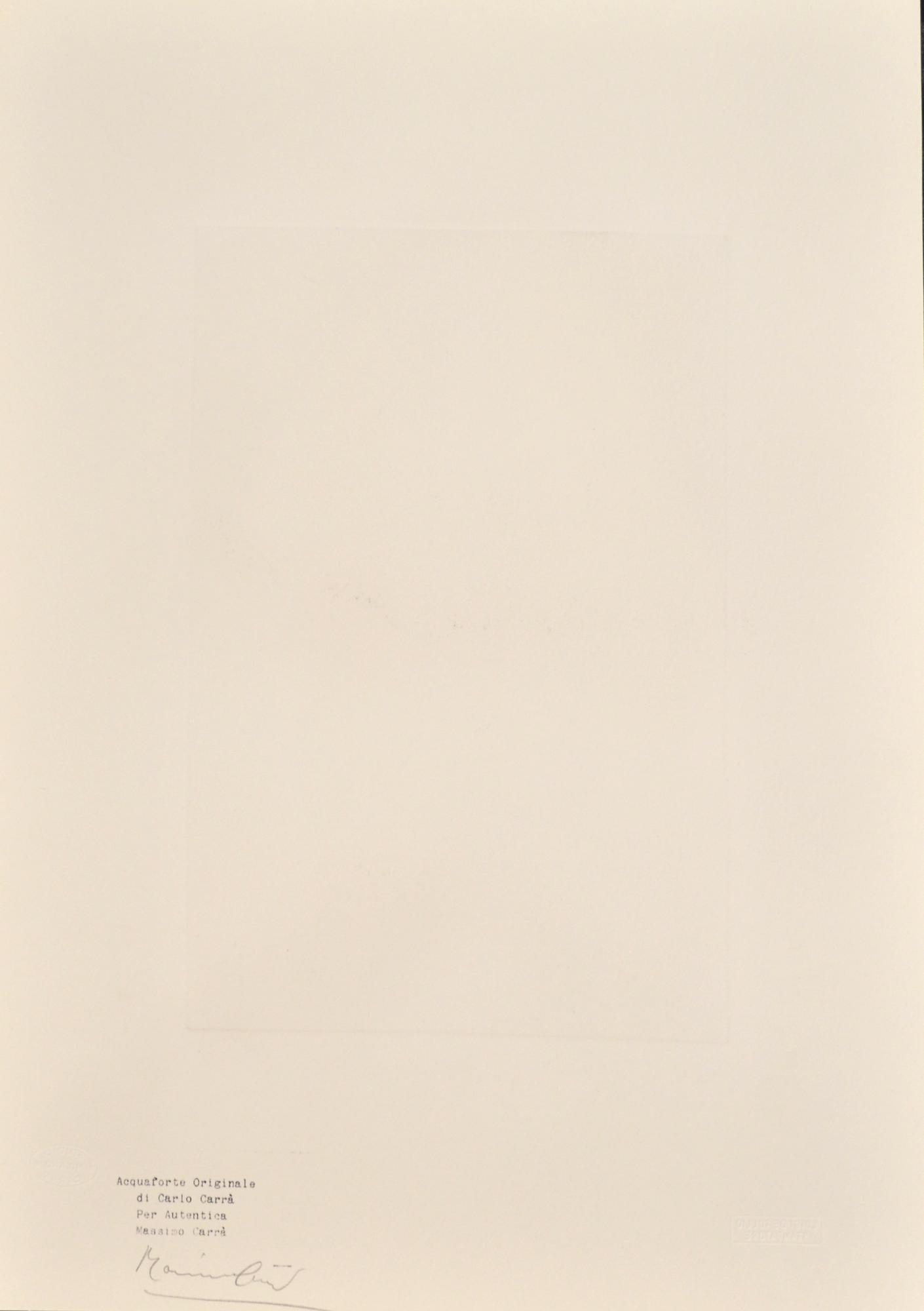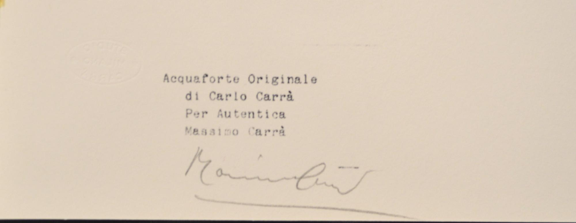 firma in lastra, titolo e tiratura; timbro a secco Luigi De Tullio Stampatore e timbro a secco Studio Carrà, Milano