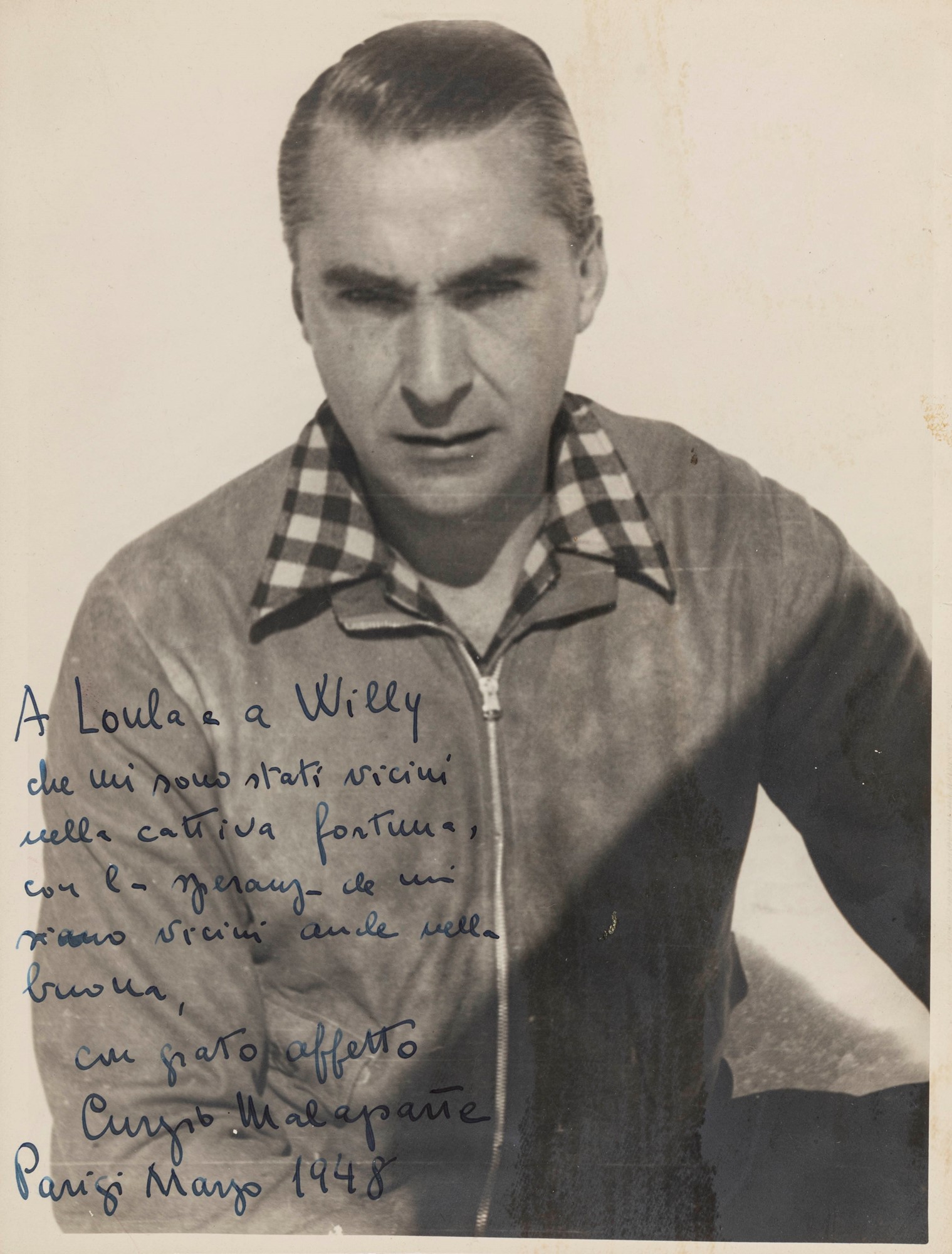C’è una lettera strappata, dattiloscritta su carta blu, di cui resta appena una pagina e mezzo, ma dove si legge: “Un giorno si saprà quel che abbiamo fatto, e vorrò vedere il muso di quei vigliacchi di Capri! La prego, anzi, le impongo, di bruciar subito questa lettera. La guerra è virtualmente finita, ma non è finita. Mi obbedisca cara Loula. Ho fatto forse male a scriverle ciò. Mi obbedisca, almeno, se vuol darmi una prova di affetto. Sappia, insomma, che gli americani sono andati su tutte le furie, quando hanno saputo che mi avevano arrestato [seguono parti cancellate]. Ciò non significa che io in avvenire non avrò noie: tenteranno di darmi noia ancora. Ma mi potrò difendere, e poi, fra un anno al massimo tutto questo sistema di arresti, di processi, etc. finirà e allora…” Di sei pagine ne restano appena tre scarse, Loula non obbedì (per nostra fortuna) all’ordine di bruciarla e così ci rimane traccia di questo delicato momento nella vita di Malaparte. Siamo senz’altro nel 1943 a ridosso dell’arresto romano, e sono anni davvero difficili. In un’altra lettera del 23 giugno (presumibilmente del 1946), consegna a Loula per il tramite di una comune amica “un pacchetto con dentro una volpe argentata e una volpe platinata. (….) Non so come andranno a finire le mie cose. Debbo aspettarmi tutte le violenze e tutte le ingiustizie possibili, specie dopo gli ultimi cambiamenti. E penso sia meglio provvedere, prendere le necessarie precauzioni. Se mi capitasse una disgrazia, dovrei pensare all’avvocato per la mia difesa. E ci vuole un grande avvocato. Ma un grande avvocato, oggi, non accetta se non ha un grosso anticipo. Cento o centocinquanta mila lire. Puoi tentare di vendere le mie volpi? Il prezzo è alto ma di tutte e due mi accontenterei di 150.000 lire. (…).