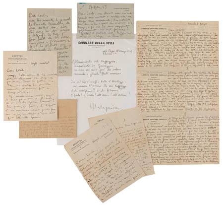 Oltre alla corrispondenza, il lotto è arricchito da diversi telegrammi, cartoline, tre belle fotografie con dedica, articoli e ritagli vari di giornale ma soprattutto tre dattiloscritti, due quali inediti. A tutto questo si aggiungono ben 12 volumi di Malaparte, quasi sempre prime edizioni, 7 dei quali recanti sentite dediche.