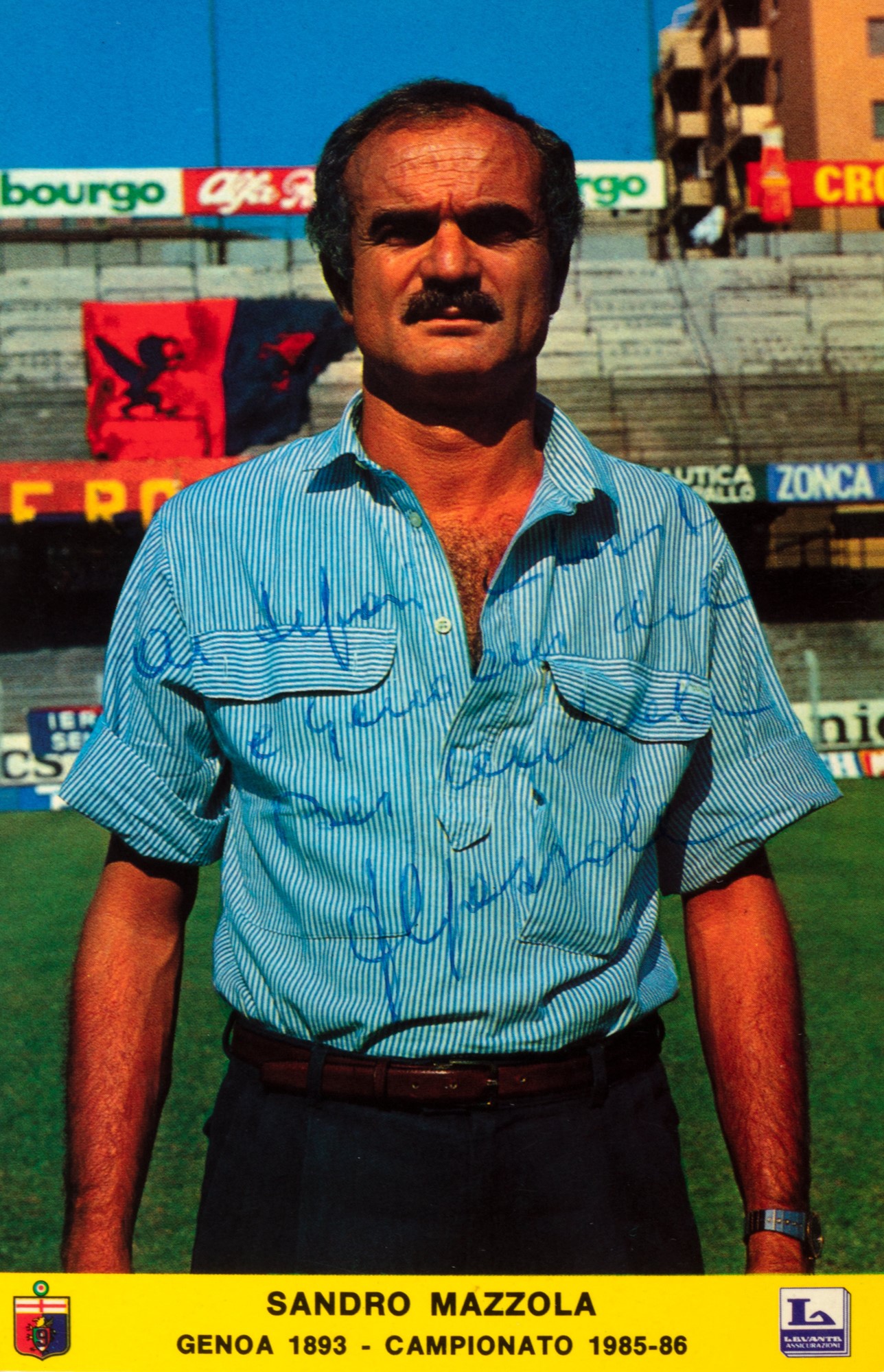 Fotocartolina del grande campione dell'Inter, 150 x 97 mm., con dedica ai tifosi genoani del bar Centrale di Genova Rapallo.