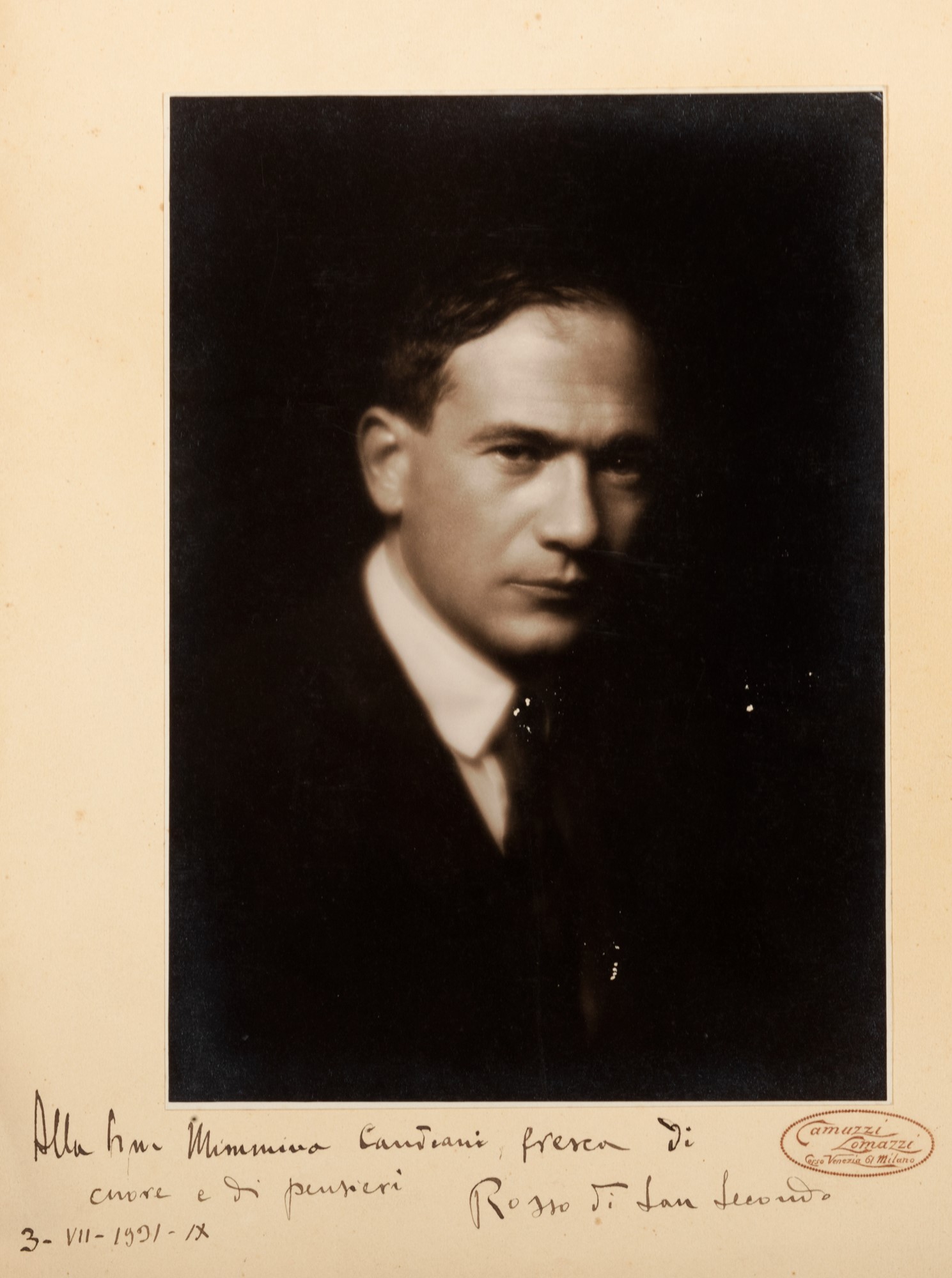 Grande bella foto realizzata dallo studio Camuzzi Lomazzi di Milano, 225 x 160 mm., incollata su cartoncino con sentita dedica in calce: "Alla sig.na Mimmina Candiani, fresca di cuore e di pensieri. 3 VII 1931. Rosso di San Secondo".