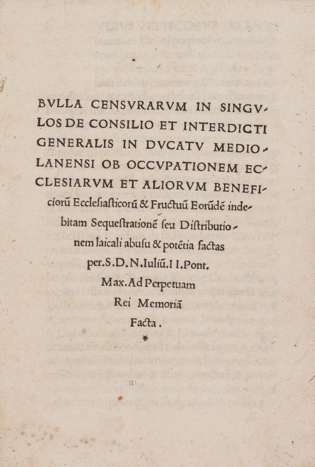 Bolla - Bulla censurarum in singulos de consilio et interdicti generalis in ducatu Mediolanensi ob occupationem ecclesiarum et aliorum beneficiorum ecclesiasticorum & fructuum eorundem indebitam sequestrationem seu distributionem laicali abusu e potentia factas per S.D.N. Iulium. II