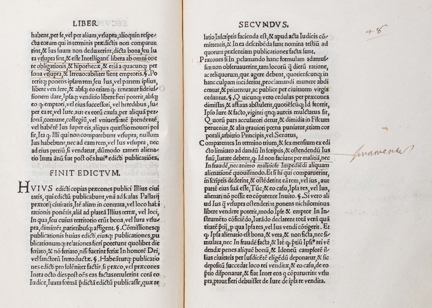 [Milano, Vincenzo Meda, 1541]. In 2°. Esemplare fittamente postillato ed interfoliato con interventi manoscritti di diverse mani dei sec. XVI e XVII, macchie ed aloni di umidità, tutti gli angoli inferiori tagliati, ultima carta rovinata, legatura in pergamena moderna.