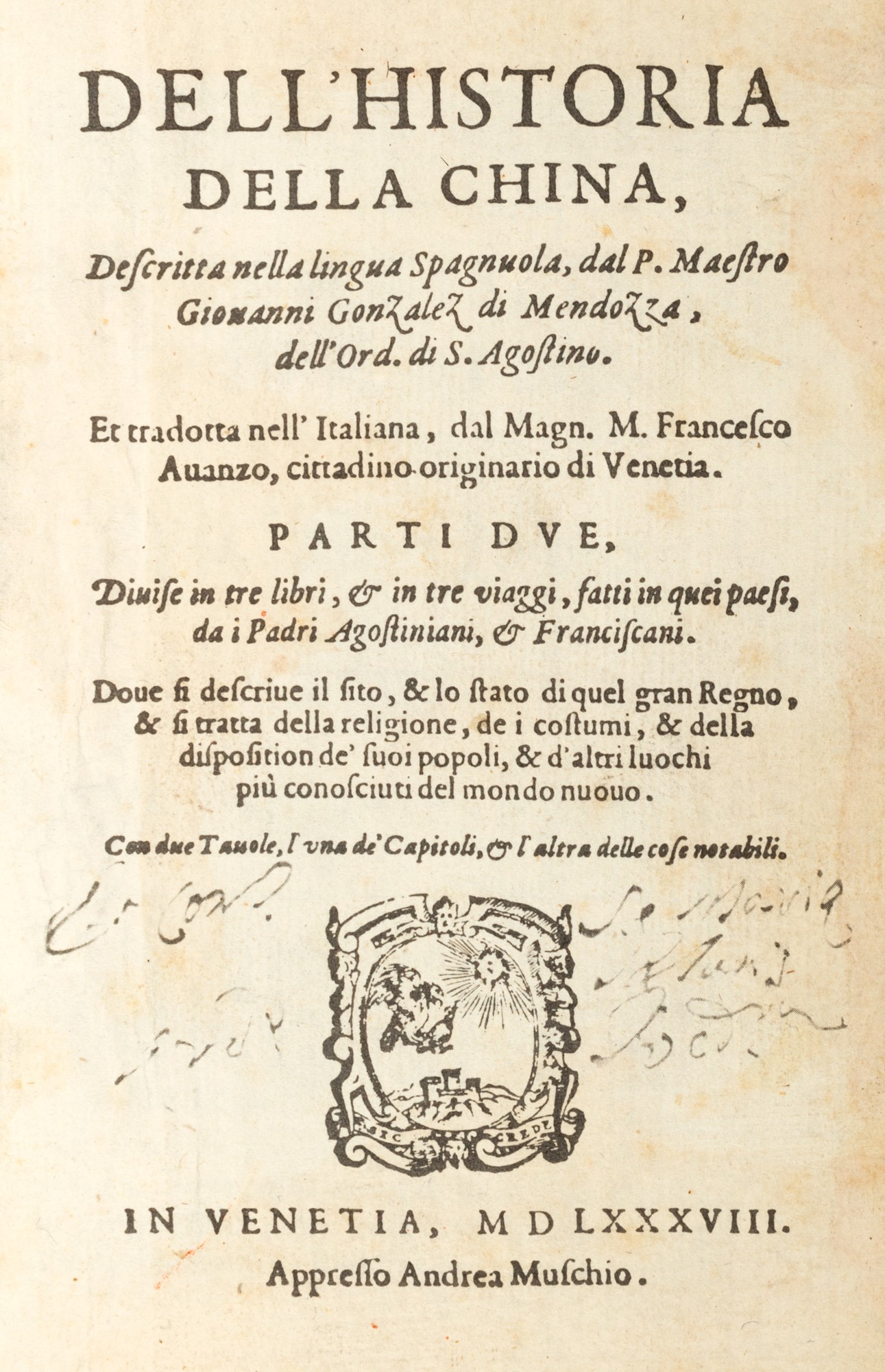 Venezia, Andrea Muschio, 1590. In 8°. Marca xilografica al frontespizio, testatine, finalini e capilettera incisi in legno, ideogrammi cinesi stampati nel testo, lavoro di tarlo alle prime 5 carte e alle ultime due, alcune gore d'acqua, leggere fioriture marginali, strappo con piccola mancanza all'angolo inferiore delle ultime 4 carte, legatura coeva in pergamena floscia, autore e titolo manoscritti al dorso, tracce di lacci, lievi difetti. § Dell'Historia della China, descritta nella lingua Spagnola. Venezia, Andrea Muschio, 1588. In 8°.Frontespizio in facsimile, mancante l'ultima carta bianca, leggera brunitura, gore d'acqua, lieve difetto al margine inferiore delle ultime carte, legatura di epoca successiva in mezza pelle e carta marmorizzata, lievi difetti.