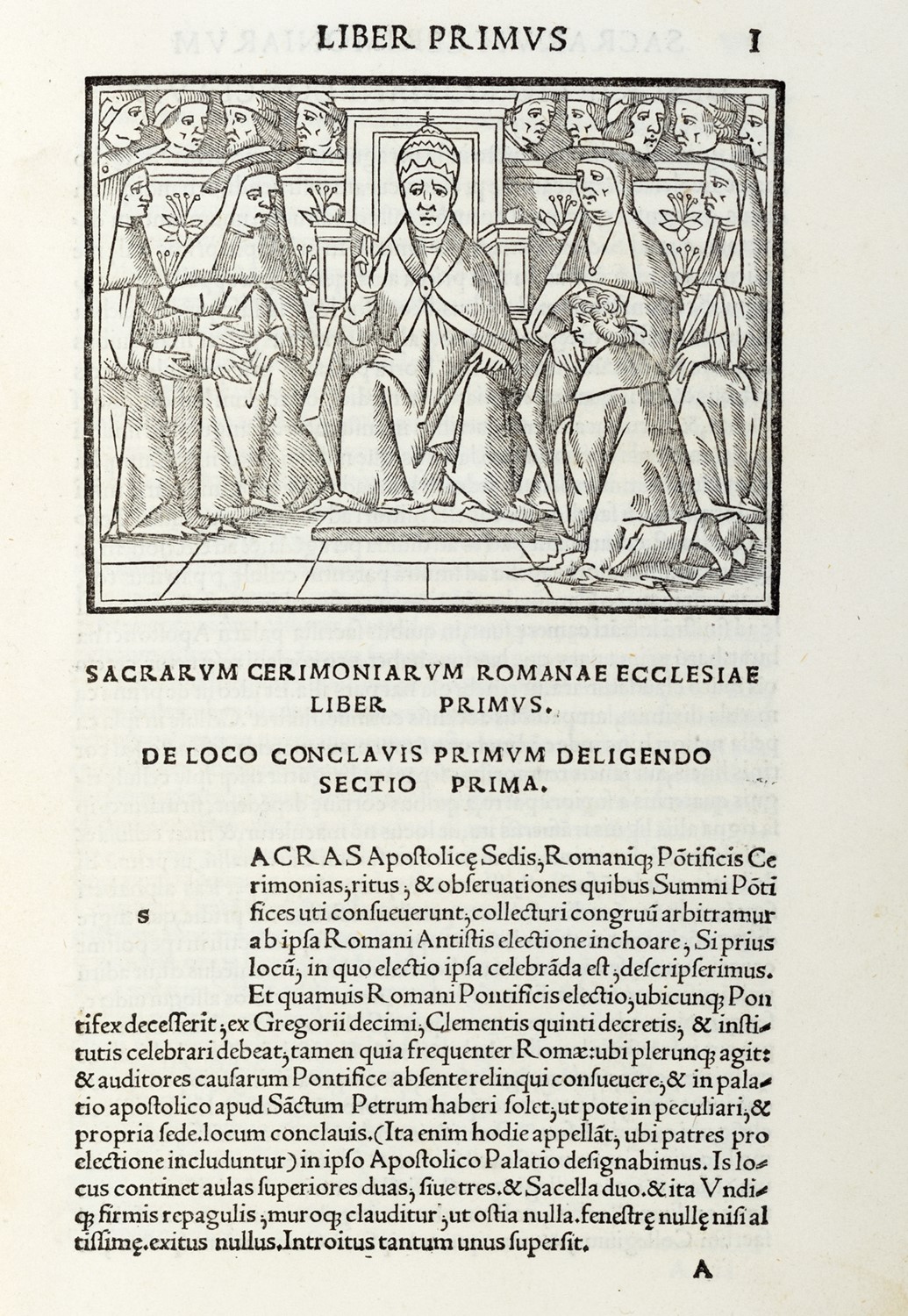 Prima edizione di quest'opera fondamentale per la storia della Chiesa, e che costituisce una sorta di cerimoniale delle sacre liturgie. L'opera e attribuita al cerimoniere pontificio A. Patrizi (cfr. Melzi II, pag. 470) che l'avrebbe composta fin dal 1488, ma la compilazione rimase inedita fino al 1516, quando Cristoforo Marcello la pubblicò, dedicandola a Leone X, e apportandone alcune modifiche.