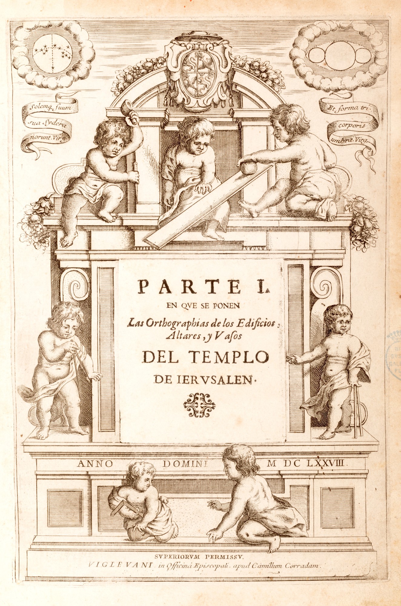Vigevano, Corrado Camillo, 1678. In 2°. L'esemplare è così composto: frontespizio parte I inciso in rame, 8 tavole num. A – H; frontespizio Parte II inciso, 70 tavole ed una carta bianca, frontespizio Parte IV, 3 carte di testo, 1 bianca, 2 carte con la “Tabla General”; Frontespizio inciso “Templum Salomonis , datato 1678, seguono 43 tavole; frontespizio Parte III inciso, datato 1678, con 36 tavole, tavola con ritratto a piena pagina di Giovanni d’Austria, 51 carte, pp.71; 22 carte di tabelle; pp. 68; 2 cc. n.n., pp.88, pp. 77, 5 carte, pp. 109, 4 carte, mancanti 8 tavole, macchie, fioriture, bruniture, legatura in pergamena dell'epoca, al dorso tassello con titolo in oro. Al contropiatto tassello cartaceo con ex libris di "Horace Landau", al frontespizio timbro di possesso di " Gustavo Camillo Galletti".