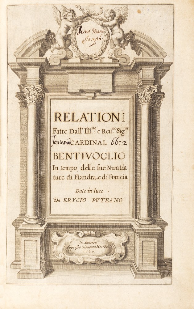 Anversa, Giovanni Meerbecio, 1629. 4°. Elegante frontespizio architettonico, lieve costante brunitura, legatura del sec.XVIII in vitello spugnato, dorso a 5 nervi, titolo su tassello rosso, tagli rossi spellature. Ex libris Conte Gioseppe Cacherano al contropiatto.§Raccolta di lettere scritte dal signor cardinal Bentivoglio in tempo delle sue nuntiature di Fiandra, e di Francia, Venezia, Antonio Tivani, 1702. In 12°.Marca tipografica sul frontespizio, brunitura leggera e fori di tarlo, legatura coeva in vitello marrone, difetti- Ex libris Guelfo Sitta. §Lettres du cardinal Bentivoglio, sur diverses matieres de politique & autres importans sujets,Bruxelles, FrançoisT'serstevens, s.d. (ma 1668?). In 8°. Bella antiporta figurata incisa in rame, testatine incise decorate, fregi tipografici, qualche brunitura, legatura in pergamena del sec XVIII, con al dorso tassello in pelle verde con titolo in oro, leggere macchie. Ex libris Guelfo Sitta al contropiatto. §Relazioni del Cardinal Bentivoglio,Colonia, s.e., 1646. In 8°. Frontespizio stampato in roso e nero e con marca, testatine ed iniziali ornate, fioriture ed arrossature, legatura coeva in vitello marrone con ai comparti del dorso fregi floreali e titolo in oro, tagli rossi, lievi mancanze, sciupati i piatti. §