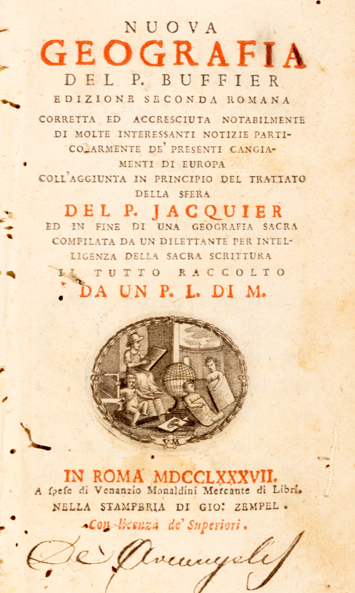 Wolfenbüttel, Konrad Buno, 1659. In 4°. Frontespizio allegorico calcografico, con 5 tavole ripiegate incise in rame fuori testo di cui una topografica di Roma e 4 geografiche d'Italia, fori di tarlo, due tavole con piccola lacuna nella parte centrale, leggera brunitura uniforme, qualche carta con lievi arrossature, legatura coeva in pergamena con tracce di lacci in seta verde, tagli blu, lacuna al dorso, fori di tarlo, difetti. Ex libris al frontespizio. § Insieme nel lotto Buffier, Claude, Nuova geografia. Roma, Venanzio Monaldini e Giovanni Zempel, 1787. In 12°. Antiporta allegorica calcografica, frontespizio in inchiostro rosso e nero con vignetta incisa in rame, con 22 carte di tavole incise in rame ripiegate, fori di tarlo, lieve brunitura omogenea, leggere fioriture, qualche strappo ad alcune tavole, e6-7 staccate, legatura coeva in pergamena, autore e titolo impressi in oro al dorso, tagli marmorizzati, piccola lacuna alla cuffia, lievi difetti. Firma di appartenenza al frontespizio.