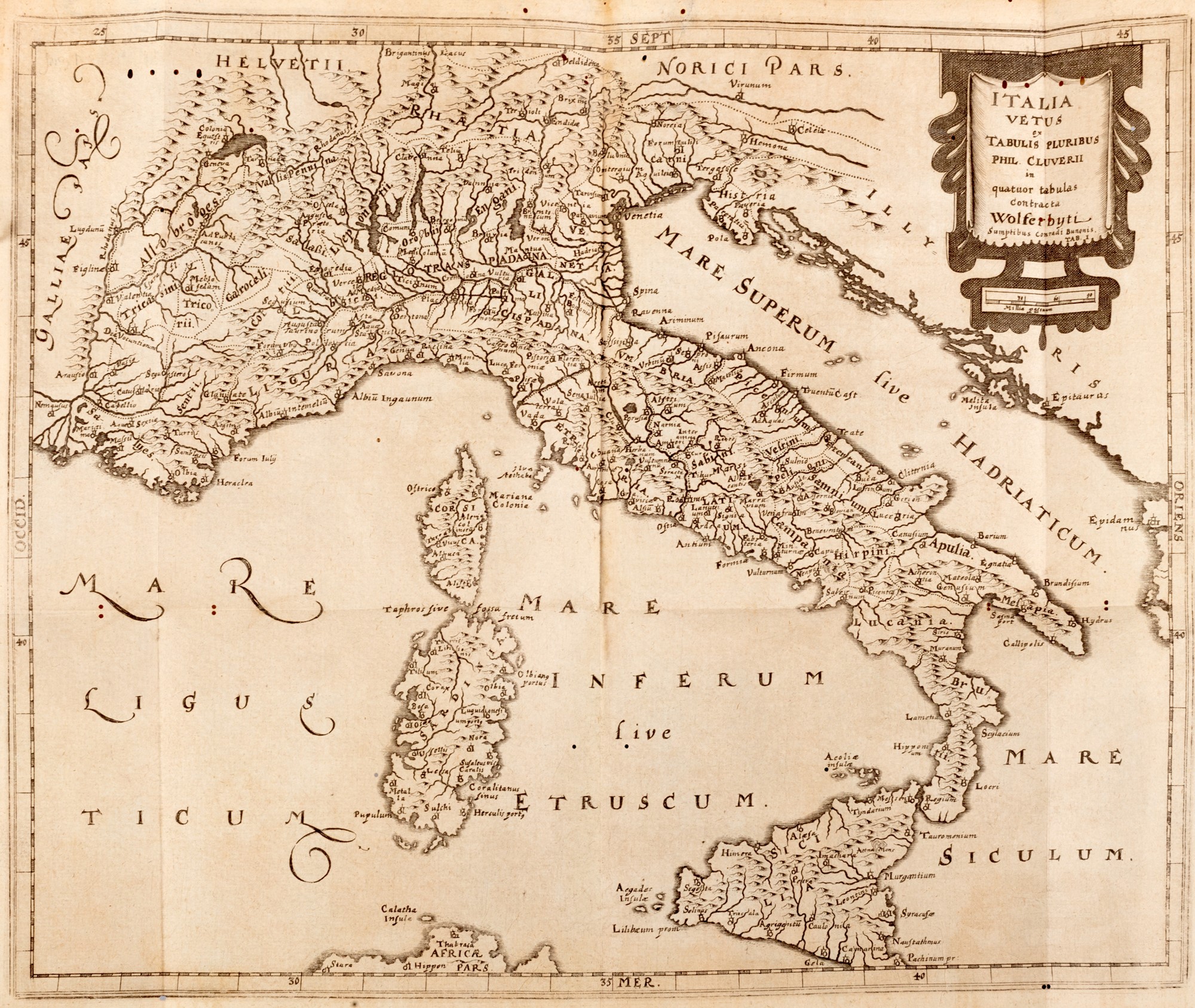 I opera: completa delle 5 tavole: Italia Vetus ex Tabula pluribus; Italiae Gallicae sive Galliae Cisalpinae; Etruria, Latium, Umbria, Picenum, Sabini , Marsi; Antiquae Urbis Romae descriptio; Campania, Samnium, Apulia, Lucania, Brutii, Corsicae, Sardiniae