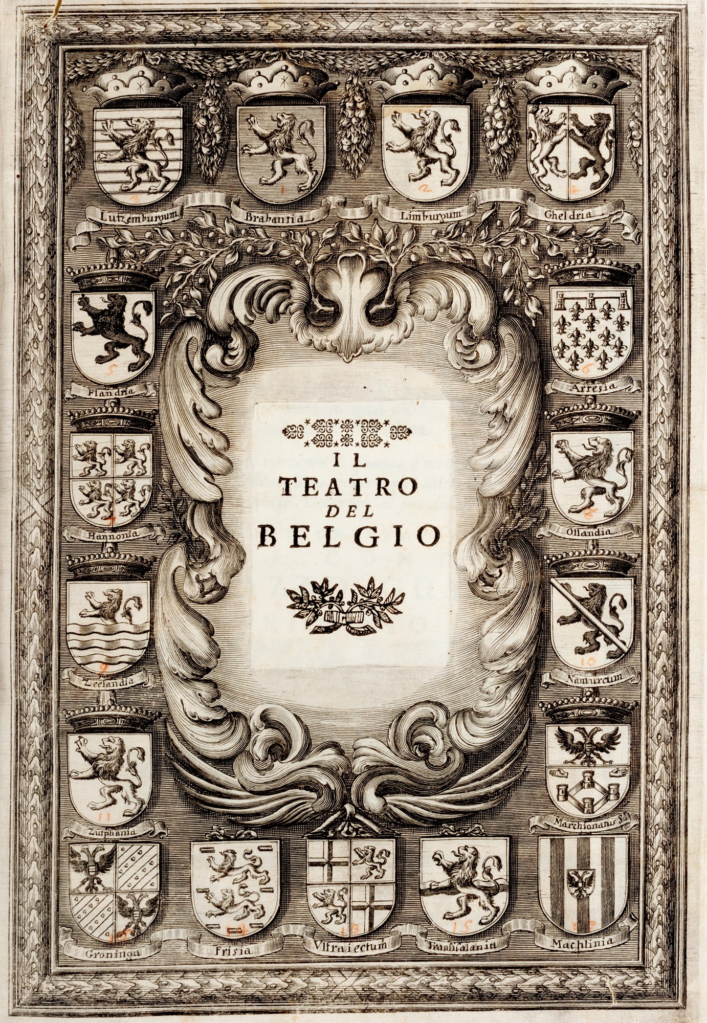 Francoforte, s.e.,1673. In 2°. π⁴χ¹A-S⁴T², ²A²-B¹χ². Antiporta calcografico con i 17 stemmi delle Province, con 3 carte di tavole non numerate e 120 tavole numerate in lastra di città fortificate, testo e frontespizio entro cornice tipografica incisa in legno, a carta C1 cartiglio editoriale incollato con correzione, leggera gora d'acqua al margine superiore di poche carte, lievissime fioriture marginali, piccolo foro di tarlo all'angolo inferiore esterno, alcune annotazioni manoscritte, mancanti le 12 tavole di ritratti, piccoli strappi al margine superiore delle carte n. 113 e 114, rari restauri, legatura coeva in mezza pergamena, tracce di tassello al dorso con autore e titolo impressi in oro, alcuni fori di tarlo, lievi difetti.