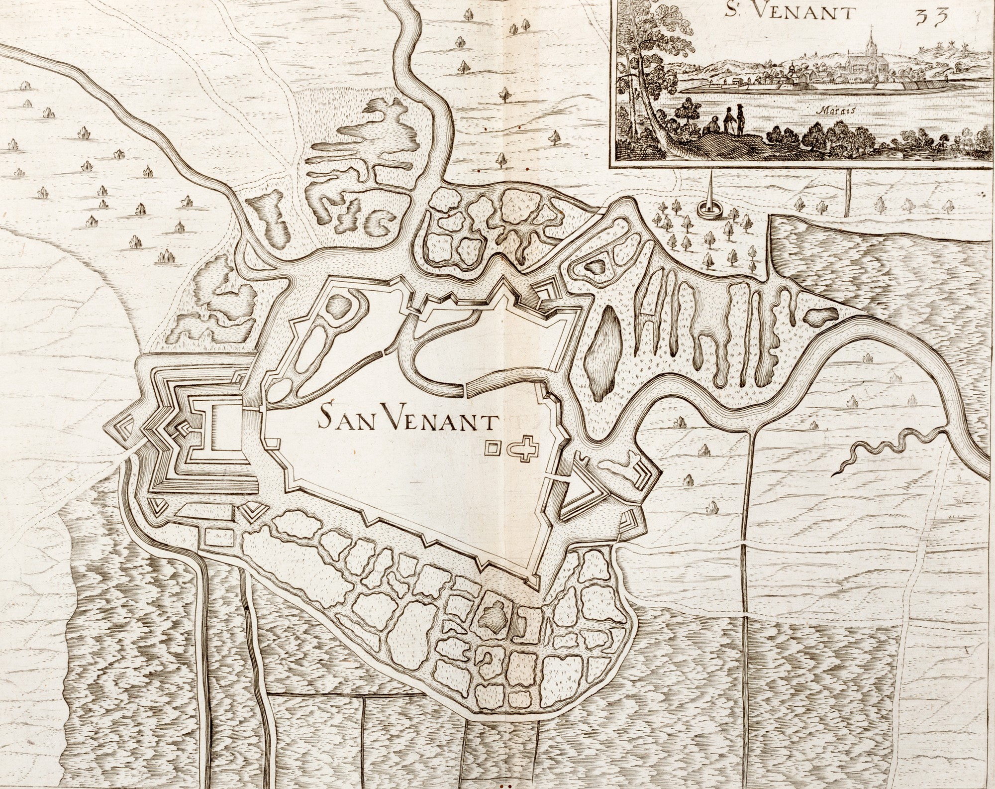 Rara prima edizione. Gualdo Priorato, Galeazzo (Vicenza 1606- ivi 1678) erudito e storiografo, seguì la tradizione di famiglia dedicandosi al mestiere delle armi: da soldato di ventura in Fiandra alle numerose campagne militari successive. Materia delle sue opere furono proprio le esperienze militari. La presente opera contiene le tre tavole non numerate che raffigurano la battaglia navale del 7 giugno 1672, il "Passage du Rhein" dell'armata francese nel 12 giugno del 1672 e la carta geografica ripiegata della Gallia e 120 carte di tavole di piante di fortificazioni di città delle 17 Provincie del Belgio.