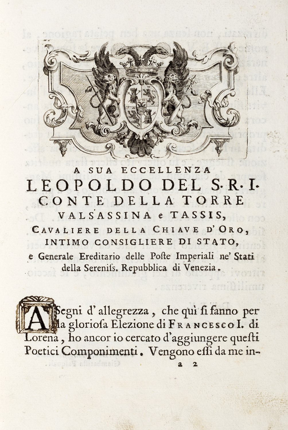 Venezia, 1746. In 8°. Fregio xilografico al frontespizio, a c. a2r testata con stemma imperiale calcografico di Francesco I, legatura posteriore in mezza pergamena.