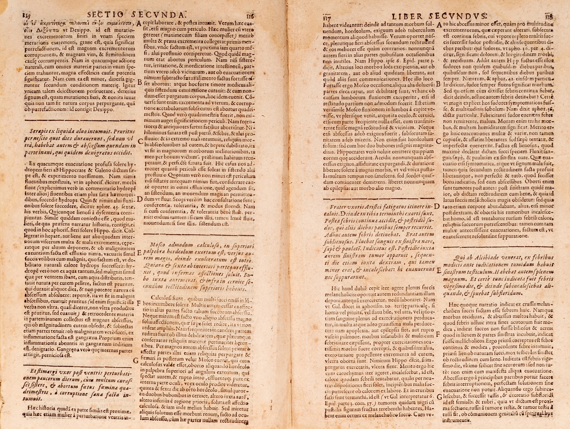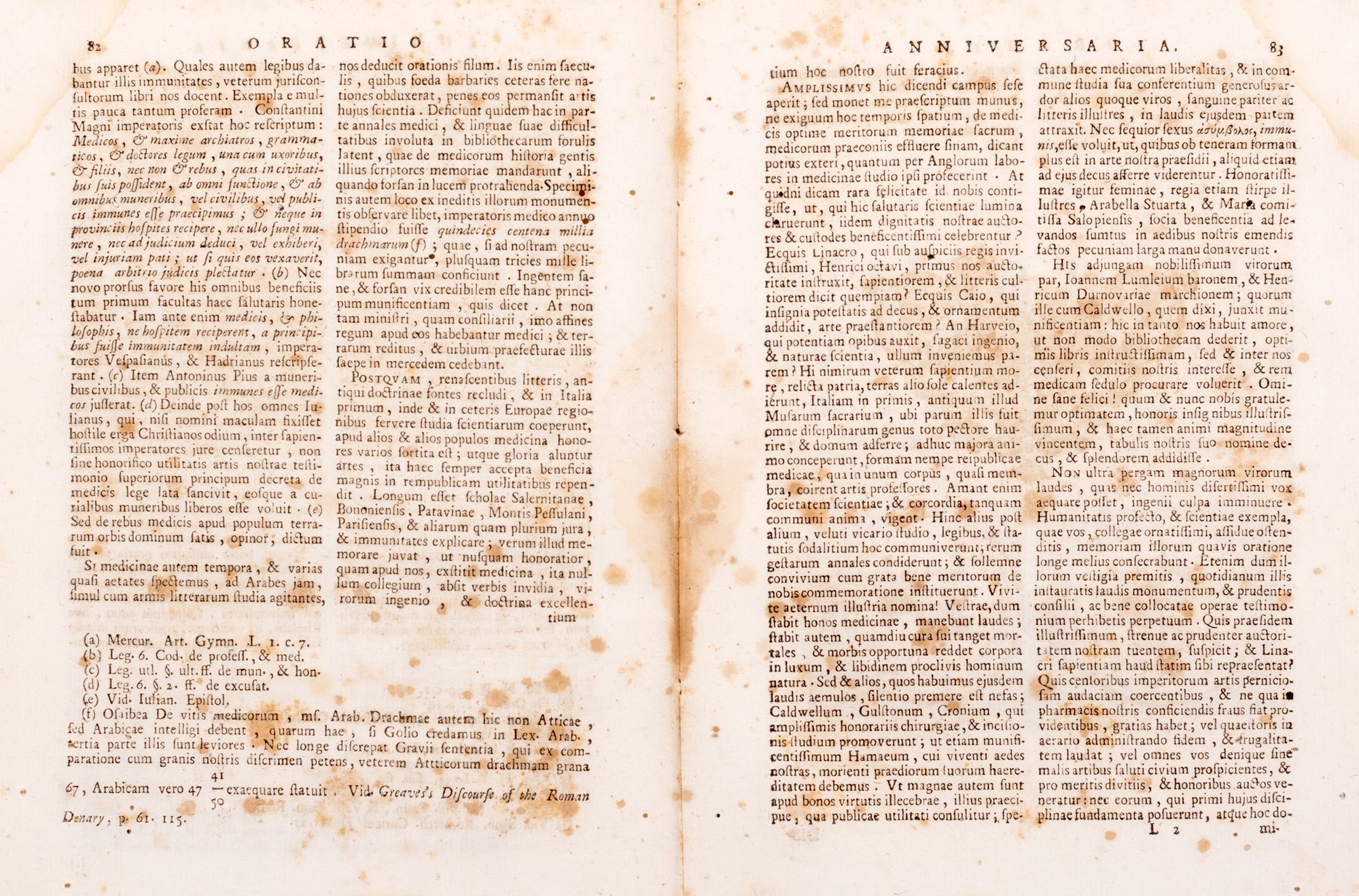 Padova, Giovanni Manfrè, 1716. In 8°. Occhietto, fregio xilografico al frontespizio, iniziali e fregi incisi in legno, lavoro di tarlo al margine interno, sporadiche fioriture, legatura coeva in pergamena, autore e titolo manoscritti al dorso, qualche foro di tarlo, piccole mancanze alle cerniere e alla cuffia, lievi difetti. § Mead, Richard. Opera medica. Figuris illustrata, Venezia, Antonio Bortoli, 1752. In 4°. 7 parti in 1 vol. Fregio xilografico al frontespizio, testatine e capilettera incise in legno, nella V parte 3 tavole numerate fuori testo, nella VII parte 4 tavole numerate su 2 fogli, fioriture sparse, fori di tarlo, qualche leggero alone, legatura coeva in cartonato, dorso parzialmente mancante, alcuni fori di tarlo. § Vallés, Francisco. Commentaria, in septem libros Hippocrat De morbis popularibus, nunc primum in Galliis excusa [...], Orléans, Claude & Jaques Borde, 1654. In 2°. Stemma del dedicatario e iniziale calcografica a χ1, fregi e iniziali xilografiche, strappo con perdita al margine inferiore del frontespizio, leggera brunitura, qualche lieve alone e fioriture, perdita di testo agli ultimi fascicoli, legatura coeva in pergamena, titolo manoscritto al dorso, mancanze al piatto anteriore, difetti. Ex libris manoscritto al frontespizio