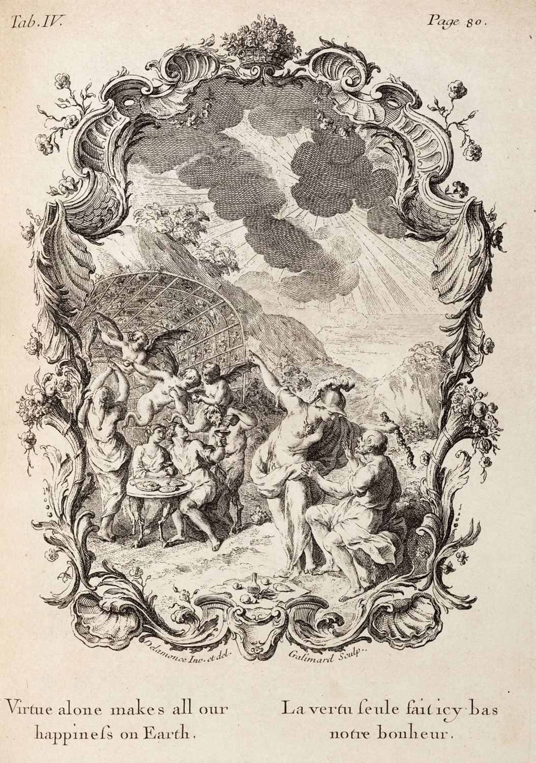 Losanna, M. Chapuis, 1762. In 4°. In antiporta ritratto del dedicatario dell'operaa piena pagina, opera di M. M. Bousquet, frontespizio stampato in caratteri rossi e neri con vignetta con ritratto dell'autore inciso da Will dopo Kneller,5 tavole a piena pagina incisi da Gallimard, numerose vignette incise da Soubeyran dopo Delamonce, lieve brunitura e qualche macchia, legatura coeva in vitello marrone, piatti inquadrati da duplice filetto in oro e piccoli festoni agli angoli.