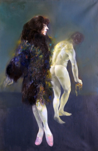 RENZO VESPIGNANI (1924 - 2001) L'angelo d'alabastro saluta nella direzione opposta , 1969 Olio su tela, cm. 195 x 130 Firmato e datato in basso a sinistra Etichetta Società Promotrice Belle Arti, Torino sul retro Etichetta Galleria Mutina, Modena sul retro Prov. Collezione Privata