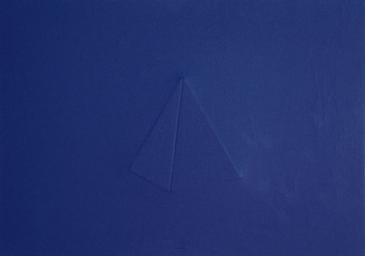 TURI SIMETI (1929) Superficie blu con triangolo , 1973 Acrilico su tela sagomata, cm. 50 x 70 Firmato e datato sul retro Autentica dell'artista su fotografia BIBLIOGRAFIA: " Turi Simeti ", Edizioni Galleria d'Arte Serego, 2004, p.14 L'opera presenta una leggera craquele Prov. Collezione Privata