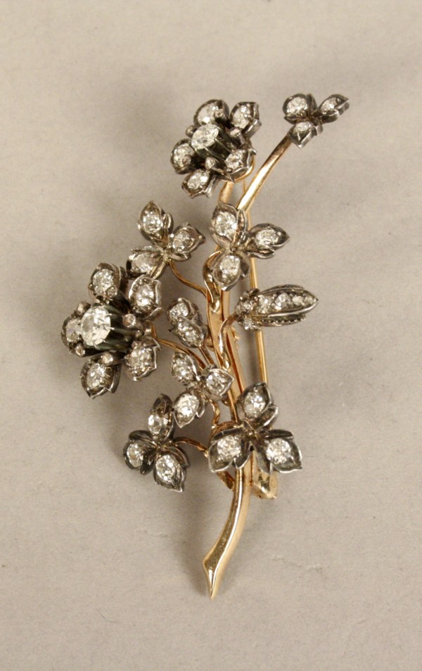 Firmato. Spilla a ramoscello in oro giallo e diamanti, gr. 27, kt 6. Inizi XX secolo.