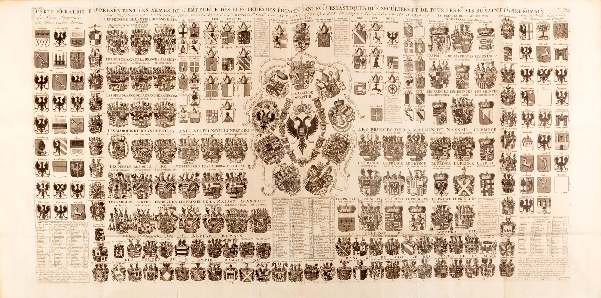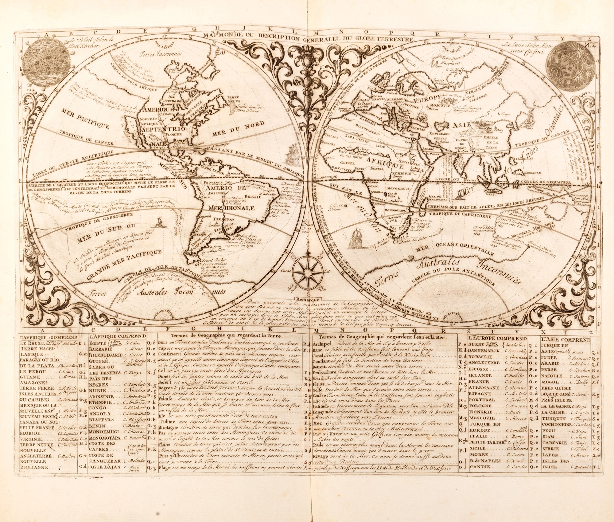 Monumentale atlante storico, completo dei sette volumi riccamente illustrati con tavole a doppia pagina, spesso ripiegate, che raffigurano carte geografiche, vedute, estratti di storia naturale e folklore, ritratti, oltre a numerosissime tavole genealogiche e araldiche. L'opera raccoglie il lascito delle scoperte geografiche avvenute dalla scoperta dell'America al sec. XVIII, basandosi in particolar modo sui viaggi di Chardin, Dapper, de Bruyn. Presente la meravigliosa mappa dell'America composta di quattro tavole assemblata in un'unica carta.