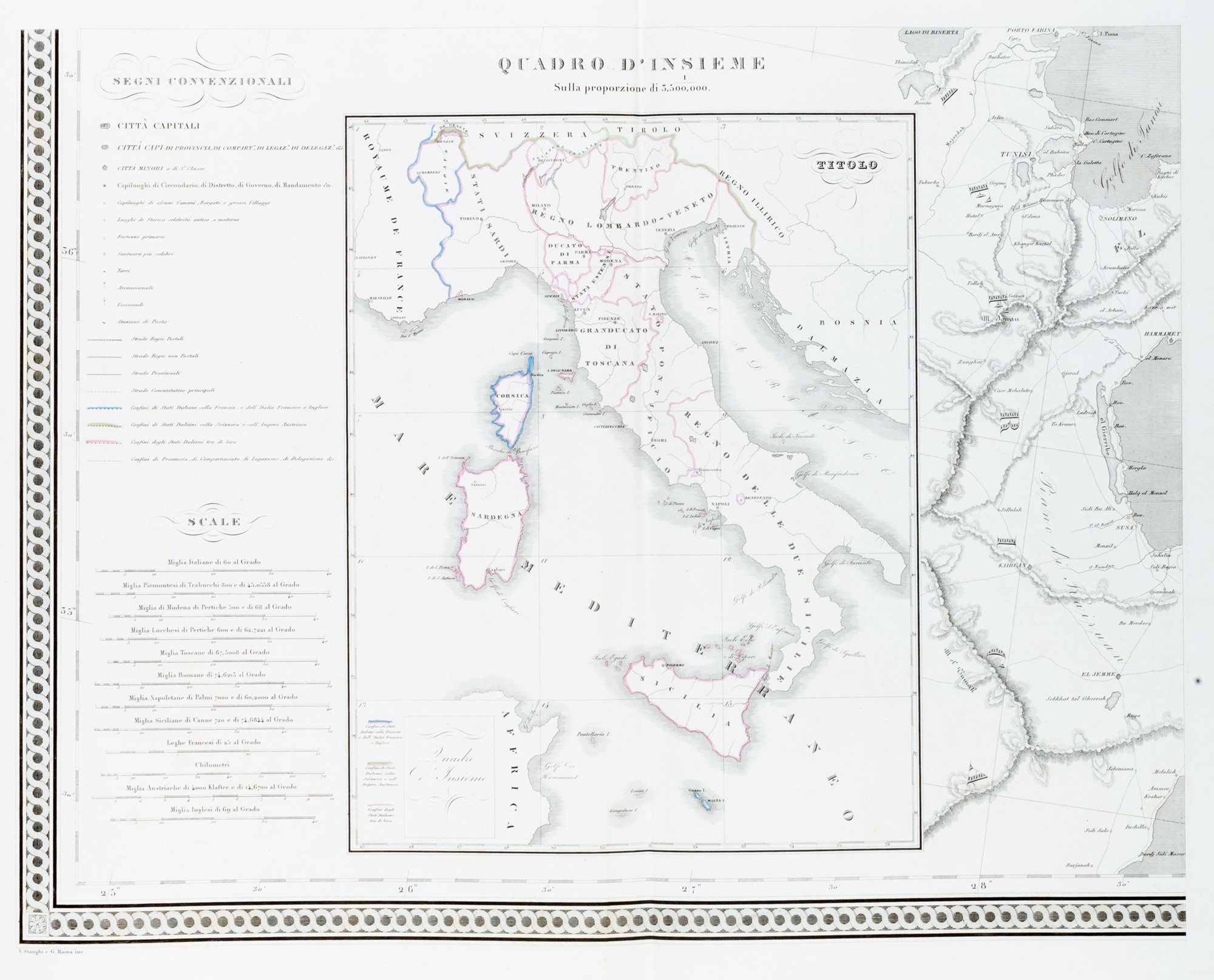 Atlante composito che comprende una tavole della Svizzera italiana, dello Stato Pontificio, del Regno Lombardo Veneto e del Regno delle Due Sicilie. Attilio Zuccagni Orlanidini fu un geografo e statistico, nato a Fiesole nel luglio 1784, morto a Firenze il 25 novembre 1872. Dal primo Atlante centrato sulla Toscana (1828-'32), passo all'idea di estendere la sua illustrazione grafica a descrittiva a tutta l'Italia nei suoi naturali confini, opera di cui annunzio la pubblicazione nel 1835 e che rimase ultimata nel 1845.