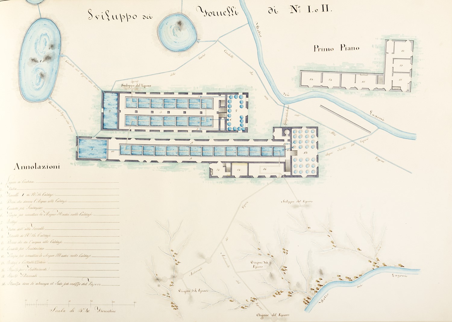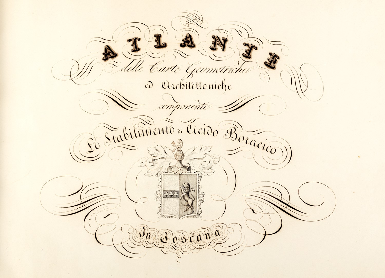 Atlante s.d.t. (ma prima metà del XIX secolo), in 2° oblungo(mm. 630 x 460), manoscritto. Frontespizio calligrafico, in calce stemma nobiliare, seguono 29 tavole eseguite in inchiostro nero ed acquerellate, che raffigurano disegni planimetrici,vedute in seppia,sezioni degli stabilimenti industriali De Larderel, nell’area dei soffioni boraciferi, legatura coeva in marocchino rosso a grana lunga, piatti inquadrati da ampia cornice impressa in oro ed secco, dorso rifatto. §Atlante delle carte geometriche ed architettoniche componenti lo Stabilimento di acido boracico in Toscana di proprietà dei Signori Chemin Pratt Lamott e Larderel, anno 1834. s.d.t. in 4° oblungo, (mm. 320 x 225). Frontespizio e 22 tavole che raffigurano vedute, disegni planimetrici, legatura coeva in pelle rossa con decorazione impressa in oro ed a secco, ai piatti 3 cornici concentriche, al centro dei piatti decorazione impressa a secco.