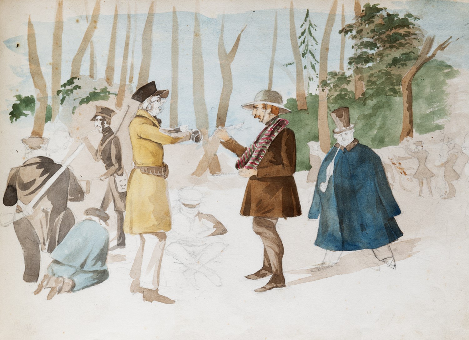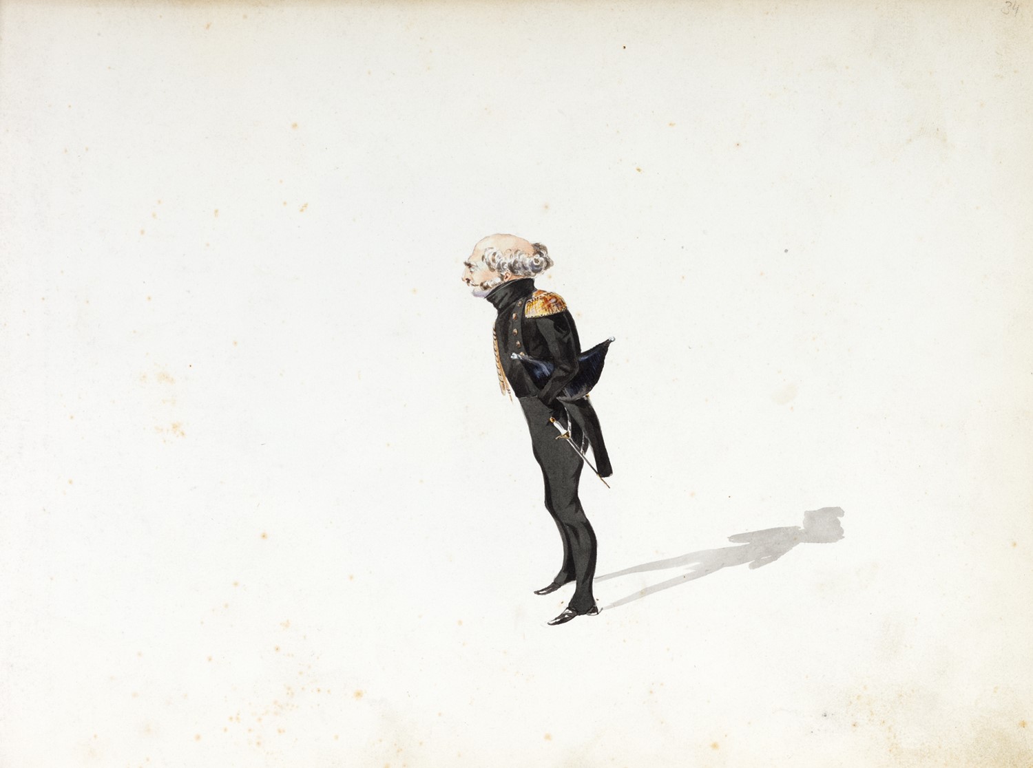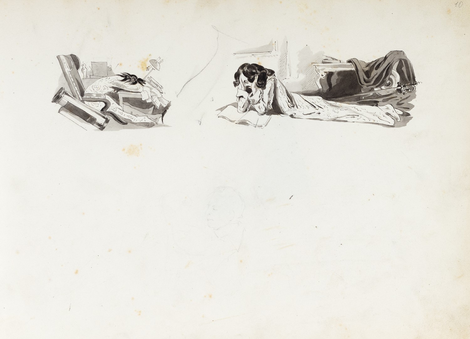 Album in oblungo, mm. 215 x 290, del sec. XIX, contenente 58 disegni, schizzi, ritratti e caricature a matita, la maggior parte finemente acquerellati, alcuni fogli con macchie e fioriture, elegante legatura coeva in pelle marrone, sui piatti elegante decorazione di ferri dorati ed impressi a secco, difetti.