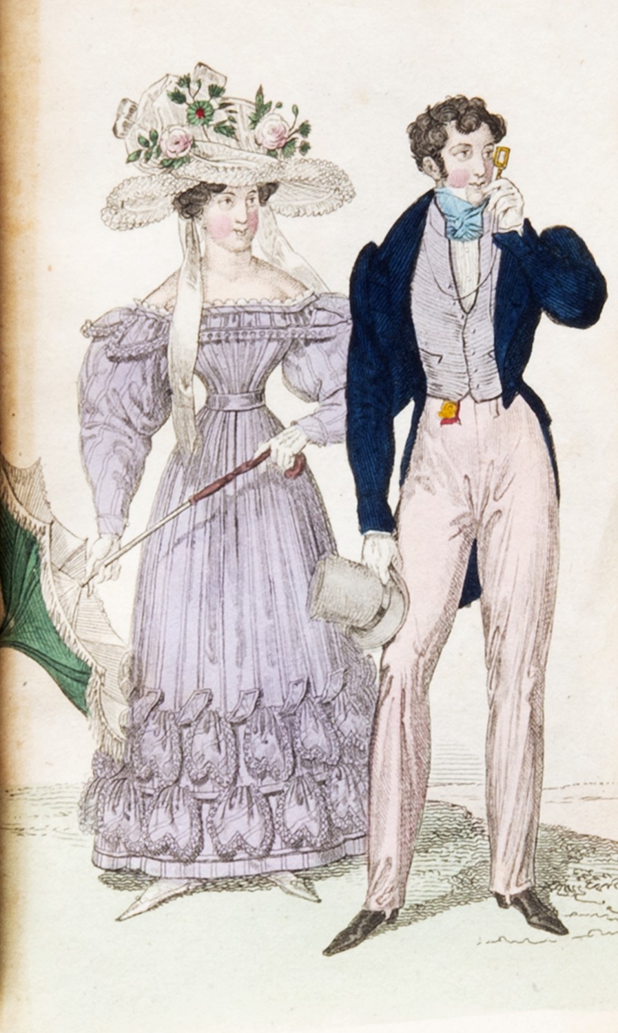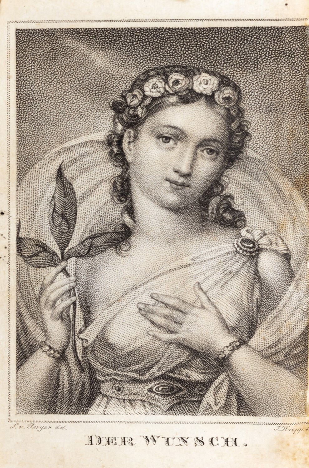 Vienna, H. Buchhholz, 1830. mm. 150 x 65. Antiporta figurata, 5 tavole a colori e 5 in bianco e nero, tutte a piena pagina ed incise in rame, graziosa legatura editoriale in cartonato rosa, decorata ai piatti a secco a rilievo così come la custodia, rovinata la custodia.