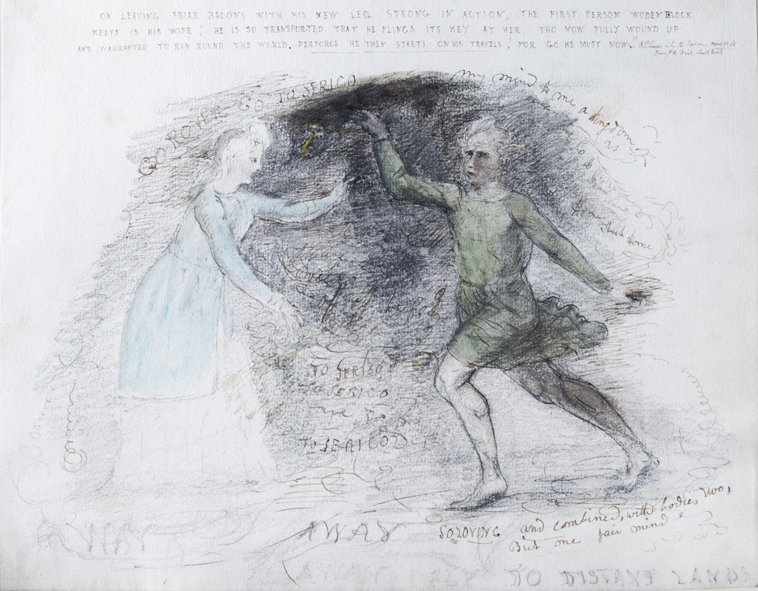 Grande volume in mezza marocchino rosso e tela rosa con titolo al dorso Etchings by R.C. Lucas Life of Friar Bacon, e su rosone al centro del piatto The Wonderful Life of Friar Bacon by R.C.Lucas 1871, misure esterne 335 x 280 mm., all'interno 104 fogli di misura 328 x 260 mm. con pagine scritte che si alternano a disegnate, moltissime ospitano incisioni di varie misure e disegni, alcune pagine a mo' di collage con testo, disegni e foto, in fine volume alcune pagine di Nature Print con un originale sistema di stampa di foglie di piante impresse su carta.