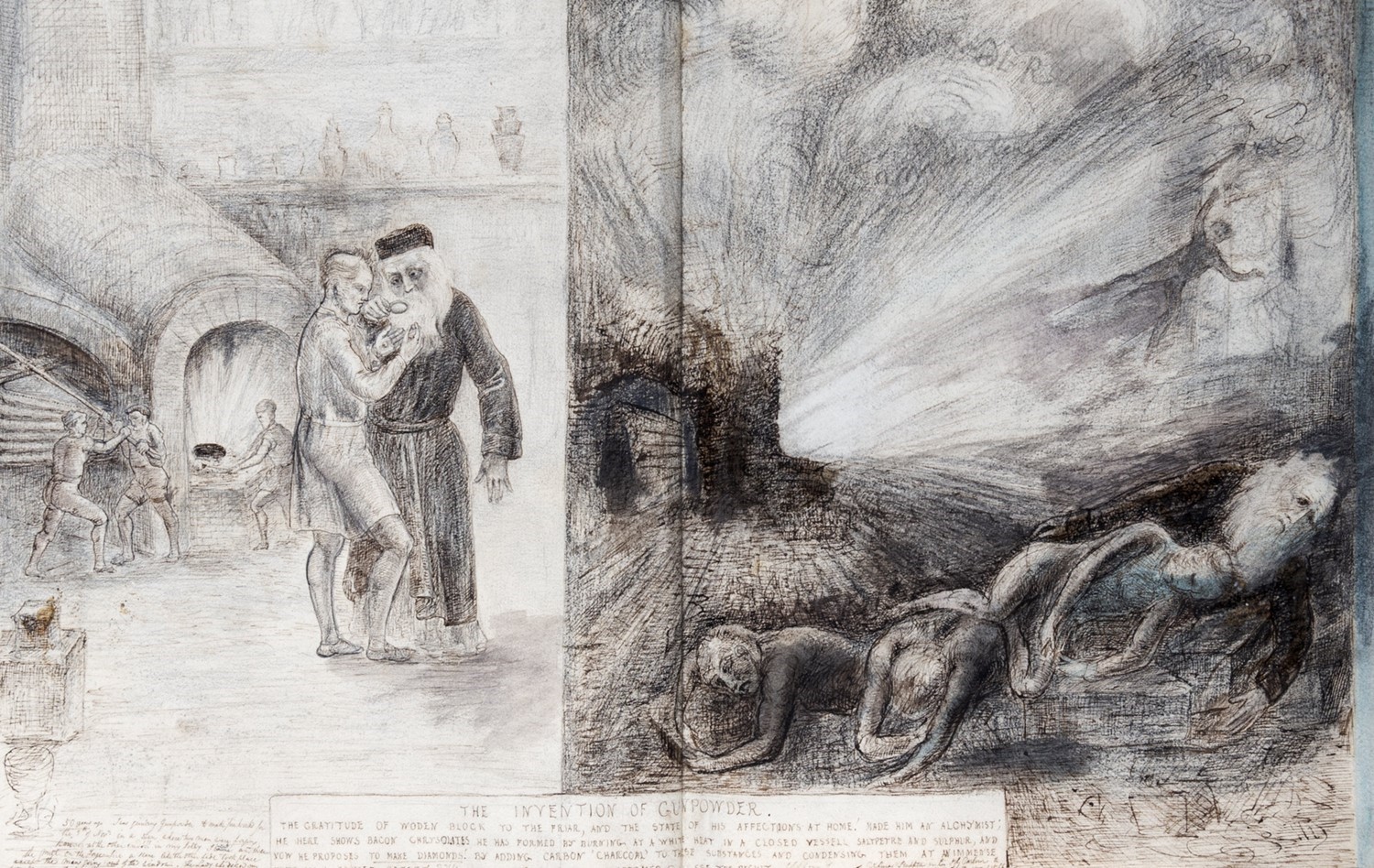 Questo che presentiamo è uno 50 “book monument” di Lucas, costruito esattamente come un libro-enciclopedico che sviluppa una o più storie mentali del suo visionario autore. Al centro del volume la storia mitica di Friar Bacon, ovvero Roger Bacon (sicuro alter ego di Lucas) nato nel 1215 a Ilchesternel Somerset; “Friar Bacon united profond science with perfect charlatism” sono una delle prime definizioni date da Lucas del suo personaggio, che progressivamente, pagina dopo pagina, si arricchisce di nuovi e misteriosi connotati. Il suo capolavoro è la Brazen Head, “a Triumph of Scientistic Skill”, che viene dettagliatamente illustrata con tavole, disegni, testi e fotografie. Bacon si trasforma progressivamente in un’alchimista, che inventa la polvere da sparo, e che con chiavi magiche e altri stratagemmi riesce a compiere miracolosi incantesimi, tutti finemente disegnati da Lucas. La storia di Friar Bacon si sviluppa sino a p.26, a seguire iniziano una serie di pagine contenenti incisioni, Some of my etchings, come vengono ben descritte a p.27v. I soggettisono i più svariati, tratti da varie serie: Illustration’s to Goldsmith’s(1841) che ritraggono villaggi deserti e scenari di campagna, il tutto però con ambientazioni neogotiche, romantiche, languidamente e cupamente espressioniste. Sembra di vedere Goya e ancor più William Blake dietro l’ispirazione simbolica e romantica di tante tavole, le più suggestive certamene quelle che illustrano l’opera di Tom Burns, Tam O'Shanter: A Tale of Brownyis and of Bogillis Fullis this Buke. Il senso del viaggio di questo cavaliere nero è tutto racchiuso in queste poche frasi: “…those who love traveled in darkness and in the tempest have had flashes of lightening for their guide, will remember the wind and fearful forms that have then been revealed…This is a fine etching transparent wierd and suggestive of the Supernatural”. Seguono altre decine di tavole, con soggetti diversi, e una bella serie di 11 Nature Print.
