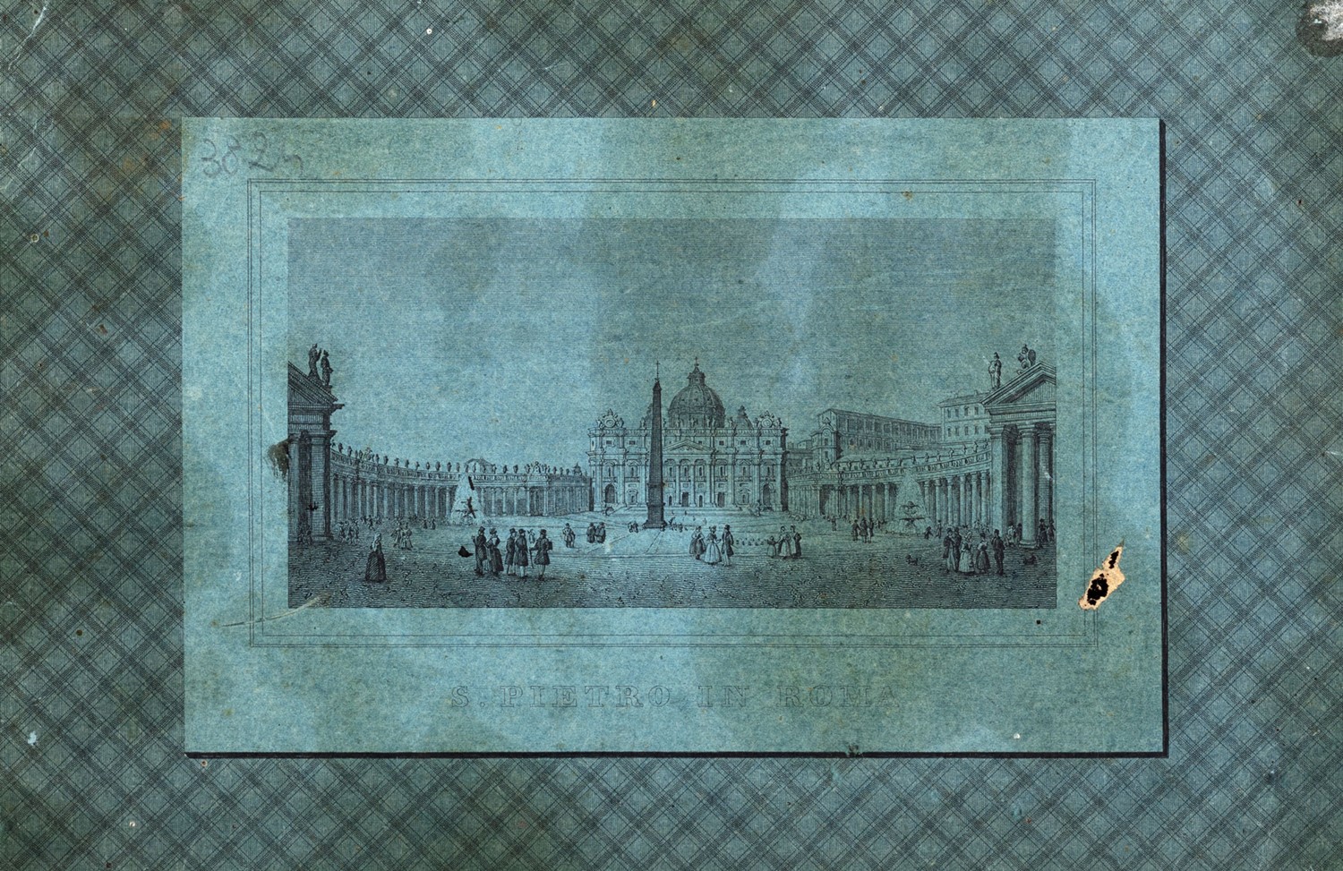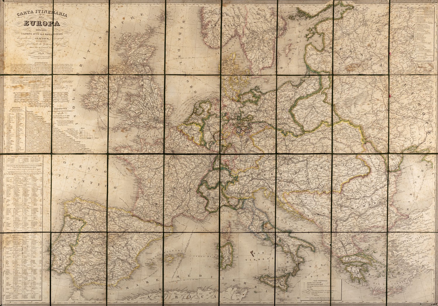 Carta geografica incisa in rame, Milano, Regazzoni, 1849. Composta di 32 carte su tela verde ripiegata, fioriture, leggera brunitura, qualche piccolo strappo ai margini bianchi, al verso della carta, applicati sulla tela due piatti in carta uno dei quali con la veduta di San Pietro stampata entro cornice.