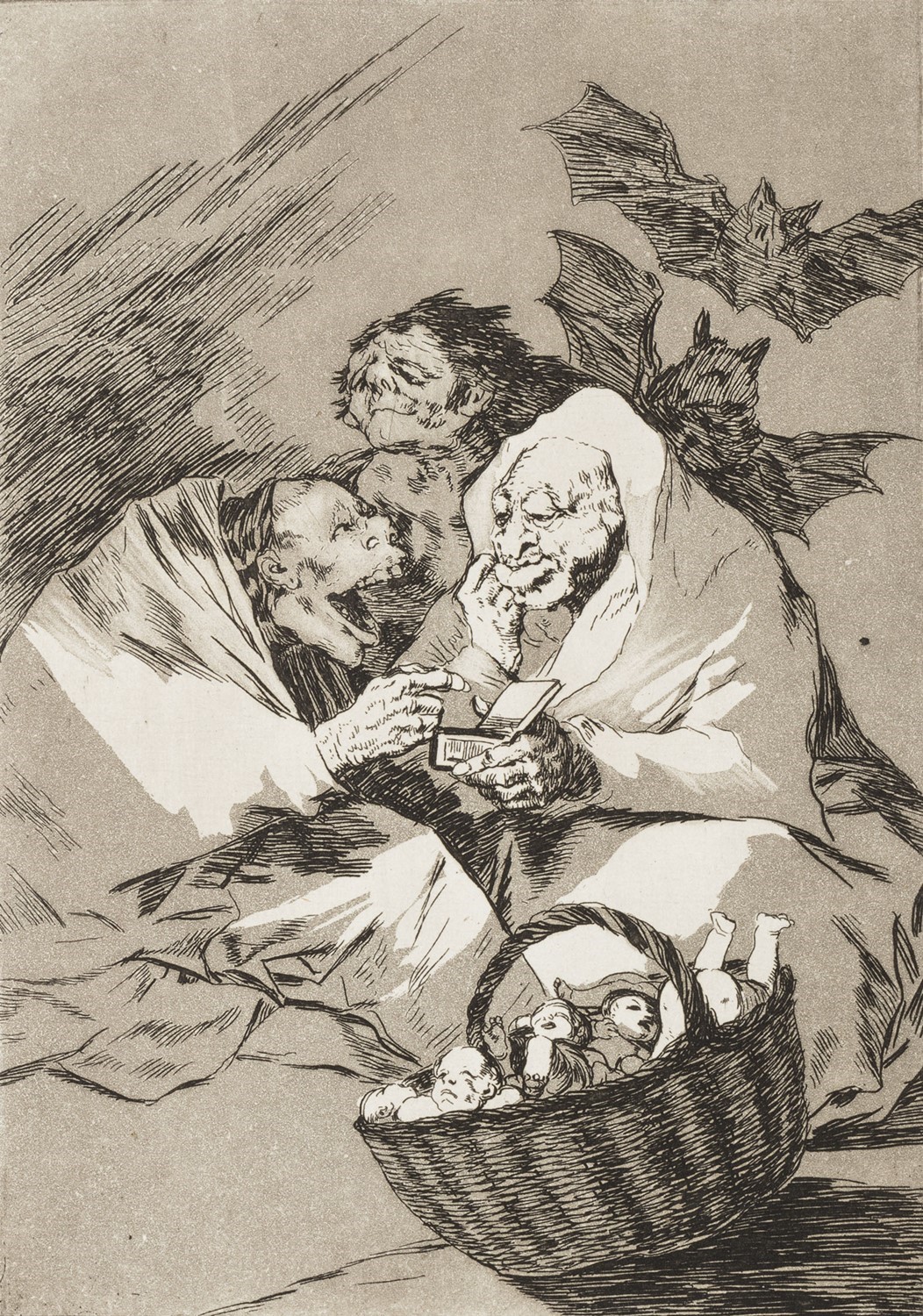 Insieme di 10 tavole dalla raccolta dei Caprichos, Madrid, Calcografia Nacional, c.ca 1855, seconda edizione, in calce a ciascun foglio una scritta in spagnolo in inchiostro bruno. I fogli sono i seguenti:n.18 Ysele quema la casa, acquaforte ed acquatinta brunita;n.21 Qua la descanonan!, acquaforte ed acquatinta brunita;n.23 Aquellos polbos, acquaforte, acquatinta brunita, puntasecca e bulino;n.33 Al conde Palatino, acquaforte, acquatinta, puntasecca e bulino; n.45 Mucho hay que chupar, acquaforte ed acquatinta brunita;n.54 El vergonzoso, acquaforte, acquatinta;n.60 Ensayos, acquaforte, acquatinta e bulino;n.62 Quien lo creyera!, acquaforte ed acquatinta brunita;n.65 Donde va mama?, acquaforte, acquatinta e puntasecca; n.70 Devota profession, acquaforte, acquatinta e puntasecca.