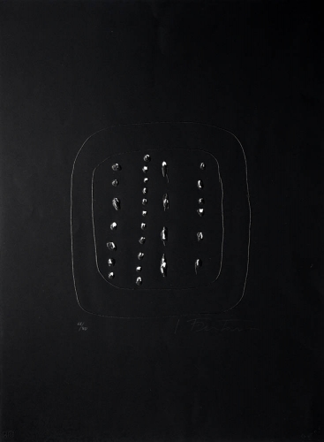 LUCIO FONTANA (1899 - 1968) Concetto spaziale , 1968 Incisione stampata in nero su carta Fabriano, con buchi, cm. 63,6 x 47,5 Firmato in basso a destra Opera n. 61/80 Timbro stampatore 2RC, Roma Edizione Galleria Marlborough, 1968 BIBLIOGRAFIA: " Lucio Fontana, incisioni, grafica,multipli, pubblicazioni ...", Reverdito Edizioni, 2007, p. 68 Prov. Collezione Privata
