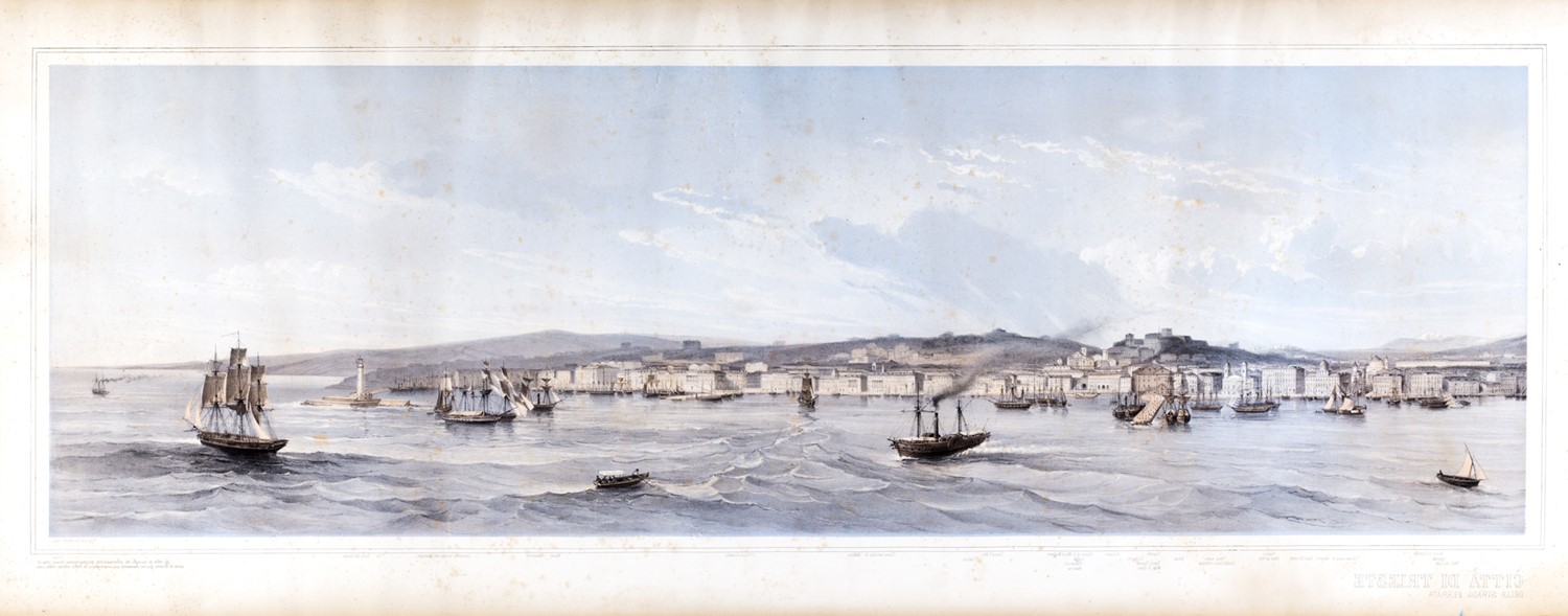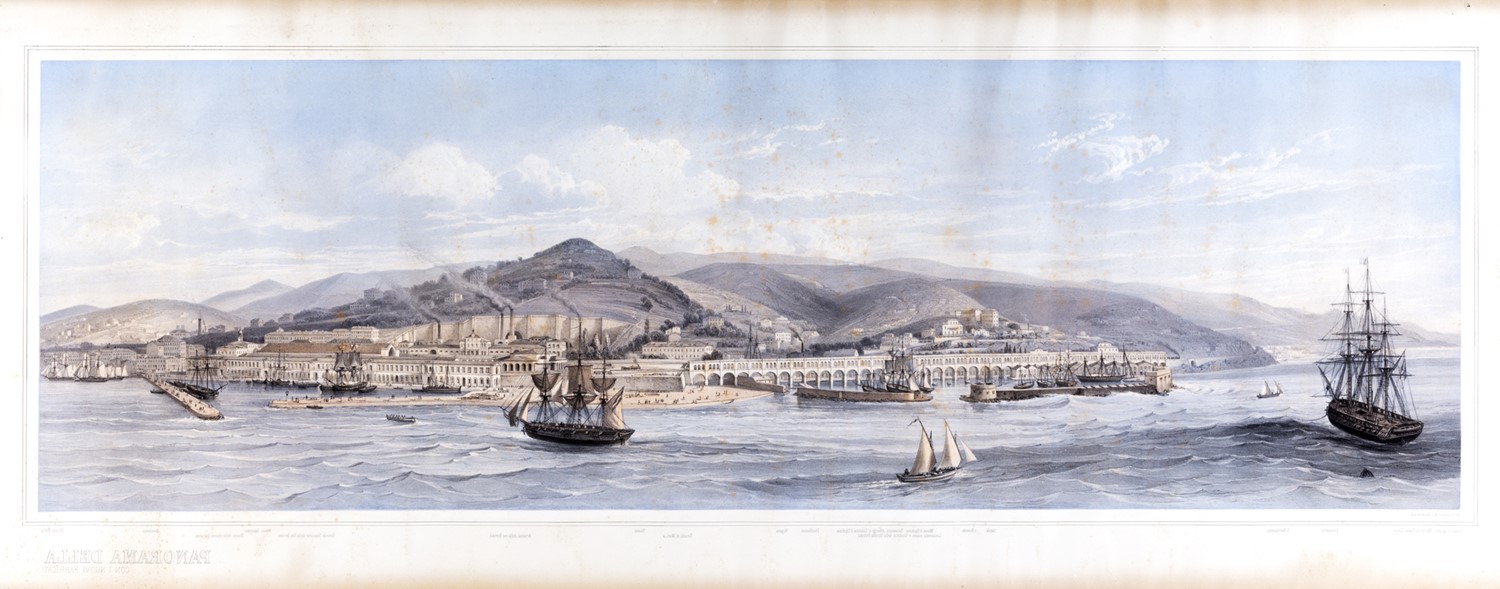 Incisioni Trieste - Cuvillier, Adrien - Jacottet, Jean - Panorama della città di Trieste con i nuovi fabbricati della strada ferrata