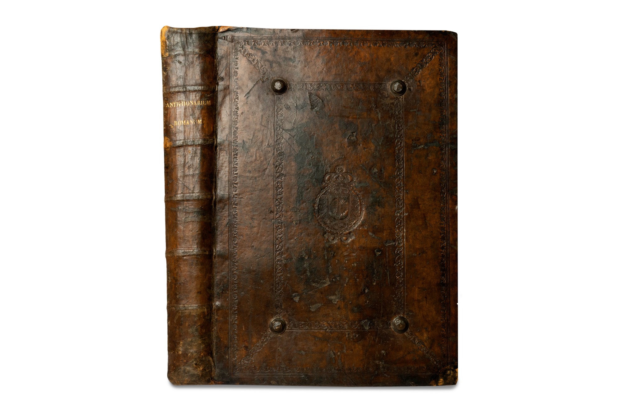 Torino, Giuseppe Pomba, 1833. In 2°. Frontespizio in inchiostro rosso e nero, con vignetta tipografica, capilettera figurati xilografici, mancanti le pp 561-576, leggera brunitura, fioriture,, qualche piccola macchia e gora d'acqua, legatura in marocchino marrone, decorazione impressa a secco, piatti inquadrati da doppia cornice con stemma al centro del campo, 4 borchie e fascia di metallo alle estremità superiore e inferiore dei piatti, qualche restauro, piccole mancanze e abrasioni, piccolo strappo alla cuffia.