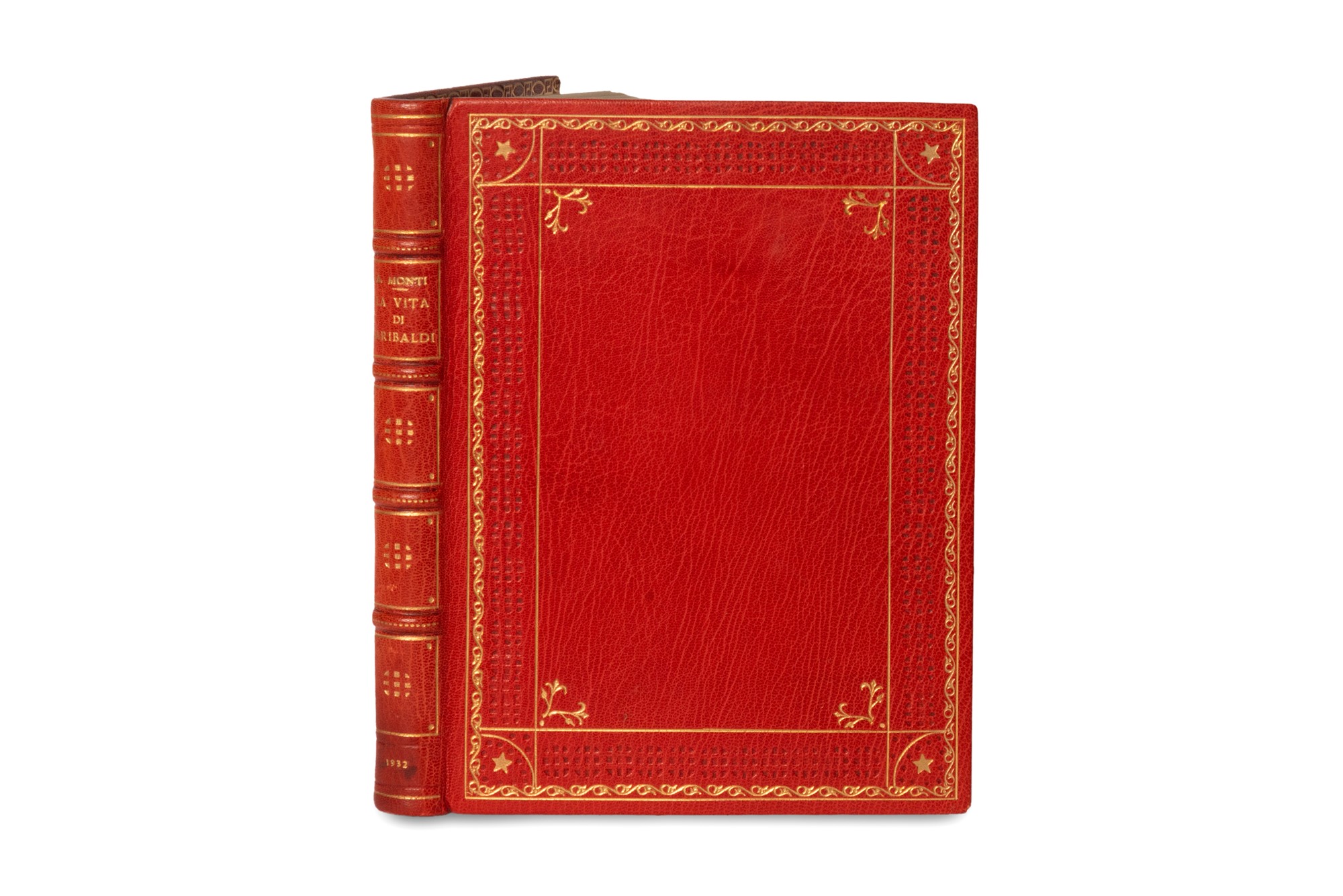 Napoli, Reale tipografia militare , 1852. In 8°. Con una grande carta geografica ripiegata in fine al volume, fregi, alla tavola piccolo strappo al margine interno e restauro, brossura editoriale conservata entro legatura in mezzo marocchino, autore e titolo impressi in oro entro tassello rosso al dorso a 5 nervi con fregi, qualche lieve alone alla brossura, lievi difetti. § Monti, Antonio, Vita di Garibaldi giorno per giorno narrata e illustrata, Miano, A. Vallardi, 1932. Con numerose incisioni nel testo, leggera brunitura, piatto anteriore della brossura editoriale conservata entro bella legatura realizzata da Giulio Scura in marocchino, piatti impressi a secco e in oro, autore e titolo in oro al dorso a 4 nervi con fregi dorati, piccola macchia al dorso.