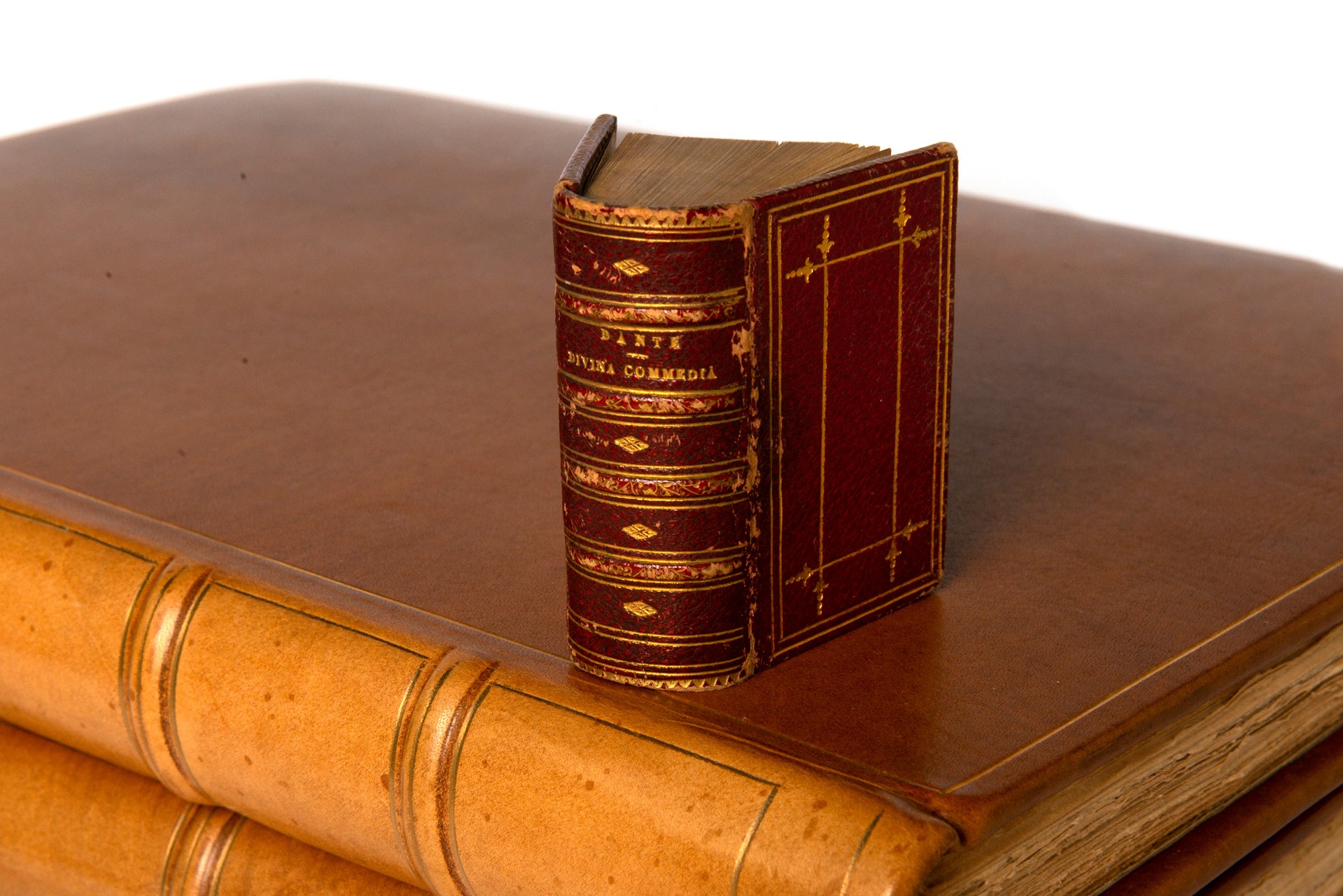 Milano, Ulrico Hoepli, 1878. cm 5,5 x 4. Ritratto di Dante in antiporta, frontespizio in inchiostro rosso e nero, nastro segnapagine in tessuto rosso, prime e ultime carte con lievissima brunitura, carte di guardia marmorizzate, legatura in marocchino rosso, fregi impressi in oro ai piatti, autore, titolo e fregi in oro al dorso a 4 nervi, labbri e dentelles interne decorati, leggere abrasioni e tracce d'uso al dorso e cerniere.