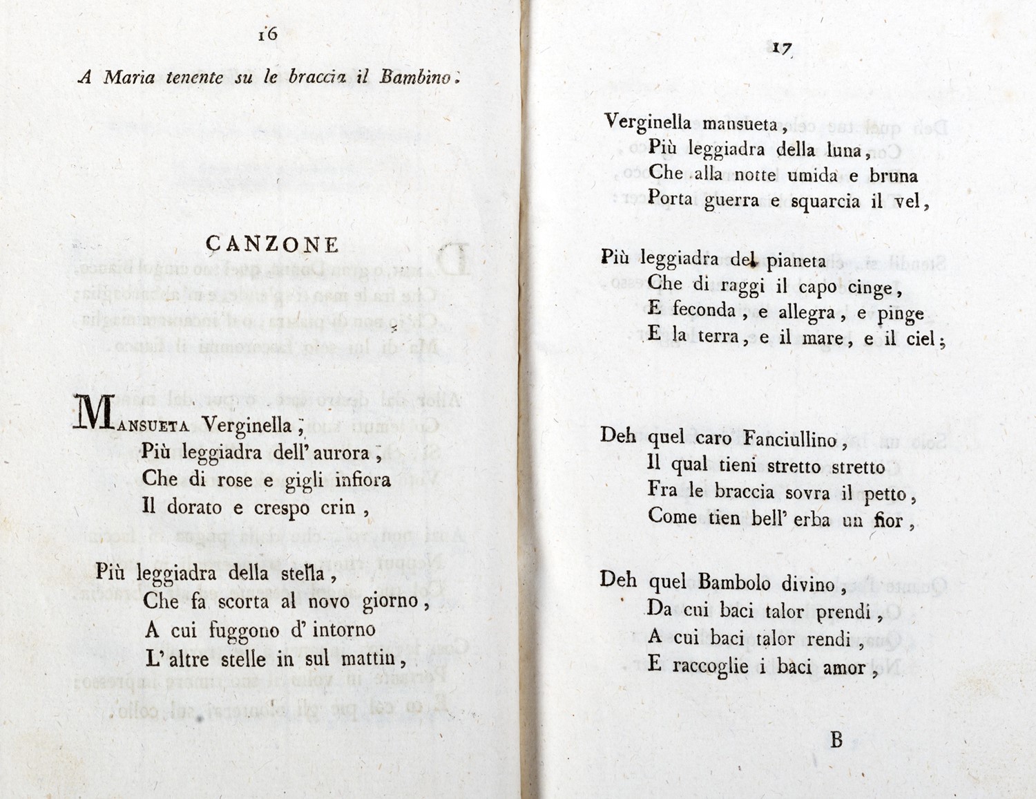 Venezia, Giustino Pasquali, 1800. 8°. Rinforzo al frontespizio, qualche arrossatura sparsa, legatura coeva in mezza pelle spugnata, titolo al dorso, tagli a spruzzo rossi. Ex libris Marchese Benedetto Mangilli; G.Sitta. Insieme nel lotto un 'edizione delleRime e Prose stampato aMilano, P. Agnelli, 1819.