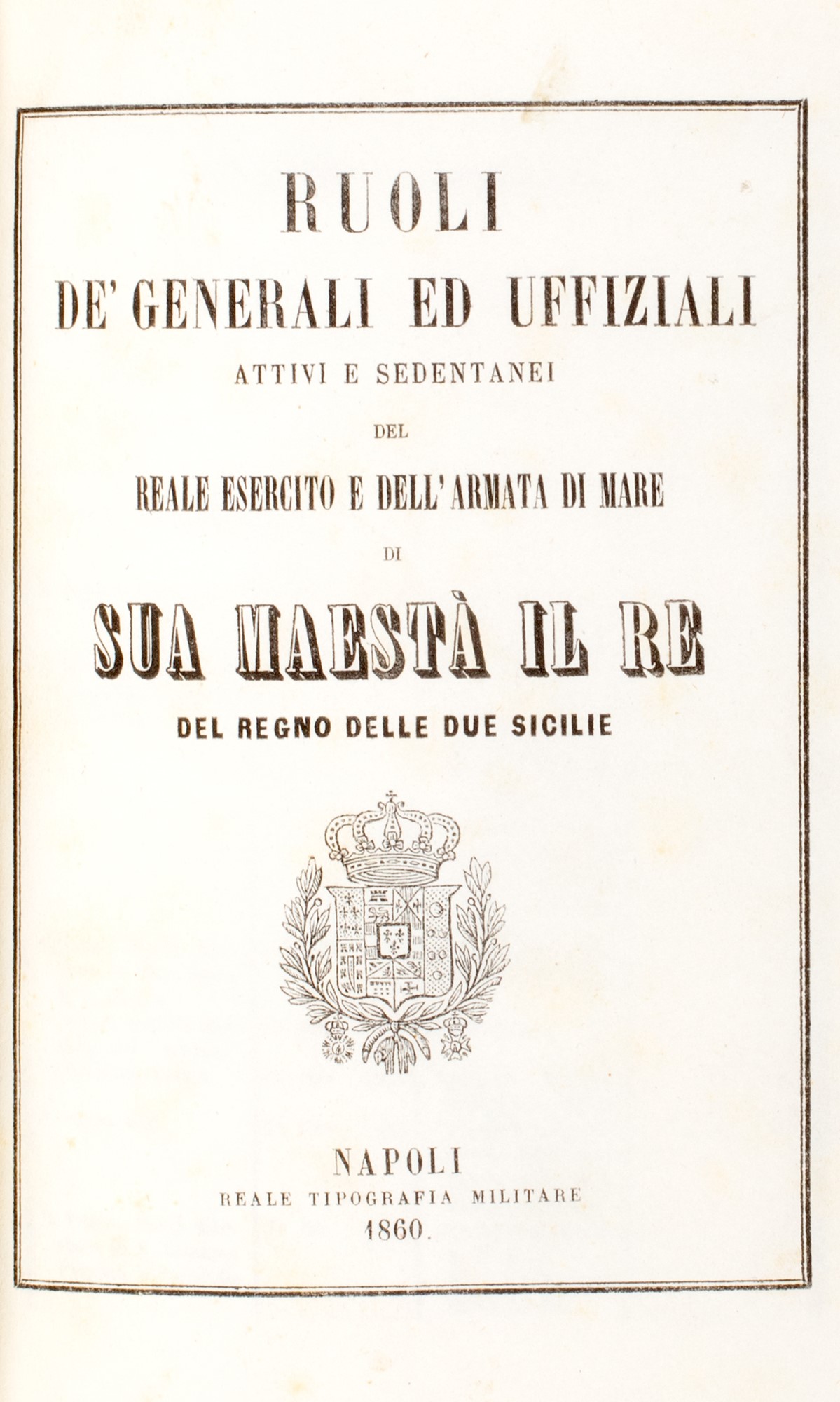 Napoli, Reale tip. Militare, 1860. In 8° grande. Al frontespizio stemma, sporadiche lievi fioriture, elegante legatura in mezza pelle, al dorso a 4 nervi, fregi e titolo in oro, lievi difetti.